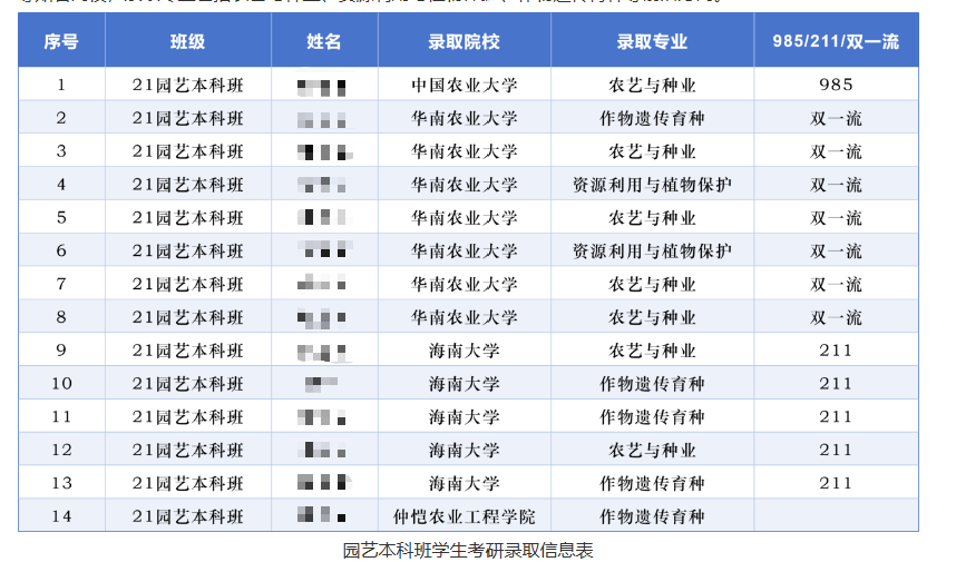 更让人惊喜的是,在2025年的硕士研究生招生考试中,这个班级的44名毕业生里,有14人成功考取研究生,考研录取率高达31.8%。而更具说服力的是,在这14名考上的学子中,有13人被国内的重点高校录取,包括了“双一流”“985”“211”级别的中国农业大学、华南农业大学、海南大学等知名学府。广农工商不仅为学生提供了高质量的实践技能,更为他们打下了扎实的理论基础,成功架起了一座通往顶尖名校深造的“跳板”。
