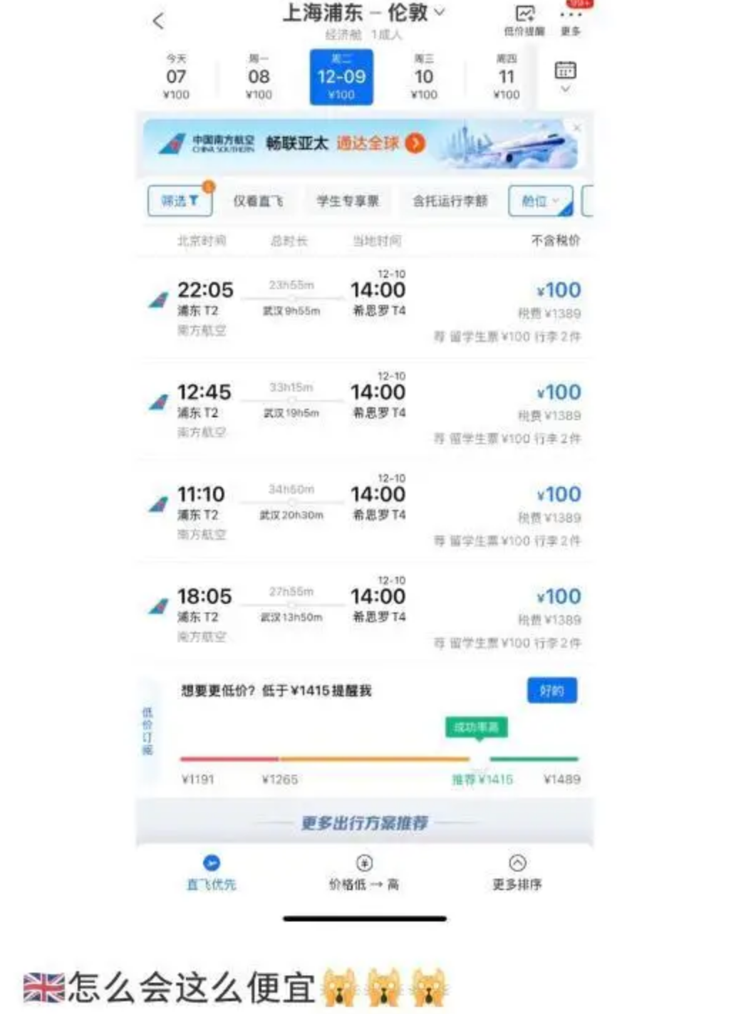 “百元机票”的真相:不含税价 vs. 含税价根据多家媒体核实,在携程等平台筛选“不含税价”后,确实能看到从12月9日至12月29日期间,有十多趟上海浦东飞伦敦的航班票面价格显示为100元。但这并非旅客最终需要支付的全部金额。