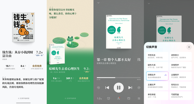 这会员一开,真是打开了新世界的大门。我最爱用的是听书功能,特别是那个“主播男声”,声音清晰又有磁性,像专业的电台主持人在给你讲课。早上赶着去上课的路上,我就戴着耳机听《钱生钱:从存小钱到财富自由》,书里那些不知不觉攒下小金库的实操方法,听得我动力十足,比干啃理论有意思多了。晚上临睡前,切换成“主播女声”听《蛤蟆先生去看心理医生》,温温柔柔的声音讲解心理学,感觉一整天的焦虑都被治愈了,特别好入睡。