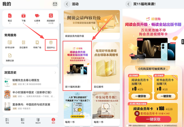 双十一的活动入口很好找,就在华为阅读“我的”页面里的“活动中心”,优惠规则写得明明白白。操作起来也简单,点进去几下就能搞定。同时还发现,如果是华为手机,把符合条件的机型系统升级到鸿蒙5.1及以上,每天去“鸿蒙有礼”页面签个到,还能抽奖领到额外的阅读会员。这种额外福利,让学生党感觉赚到了。