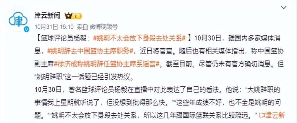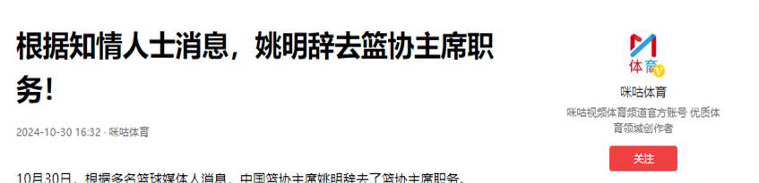 事情的开端要追溯到10月30日,当时多家篮球媒体纷纷爆料称,姚明已经主动请辞中国篮协主席一职,并且还透露了接班人是“级别不低的专业人士”。这一消息瞬间在网络上引发了热议,球迷们纷纷表示震惊和不解。毕竟,姚明作为中国篮球的旗帜性人物,他的去留无疑牵动着无数人的心。