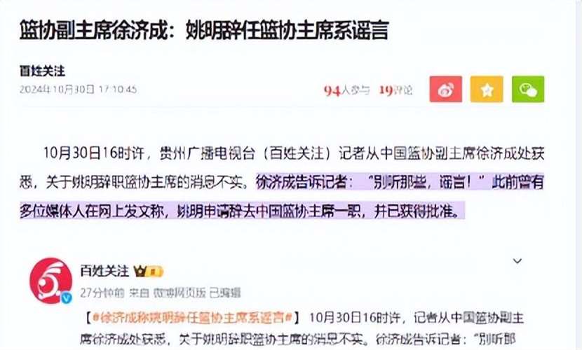 姚明请辞篮协主席,CBA董事长徐济成辟谣反被打脸,新任主席郭振明引关注