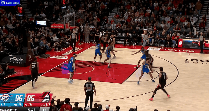 NBA常规赛,雷霆对阵开拓者的比赛正在进行中。