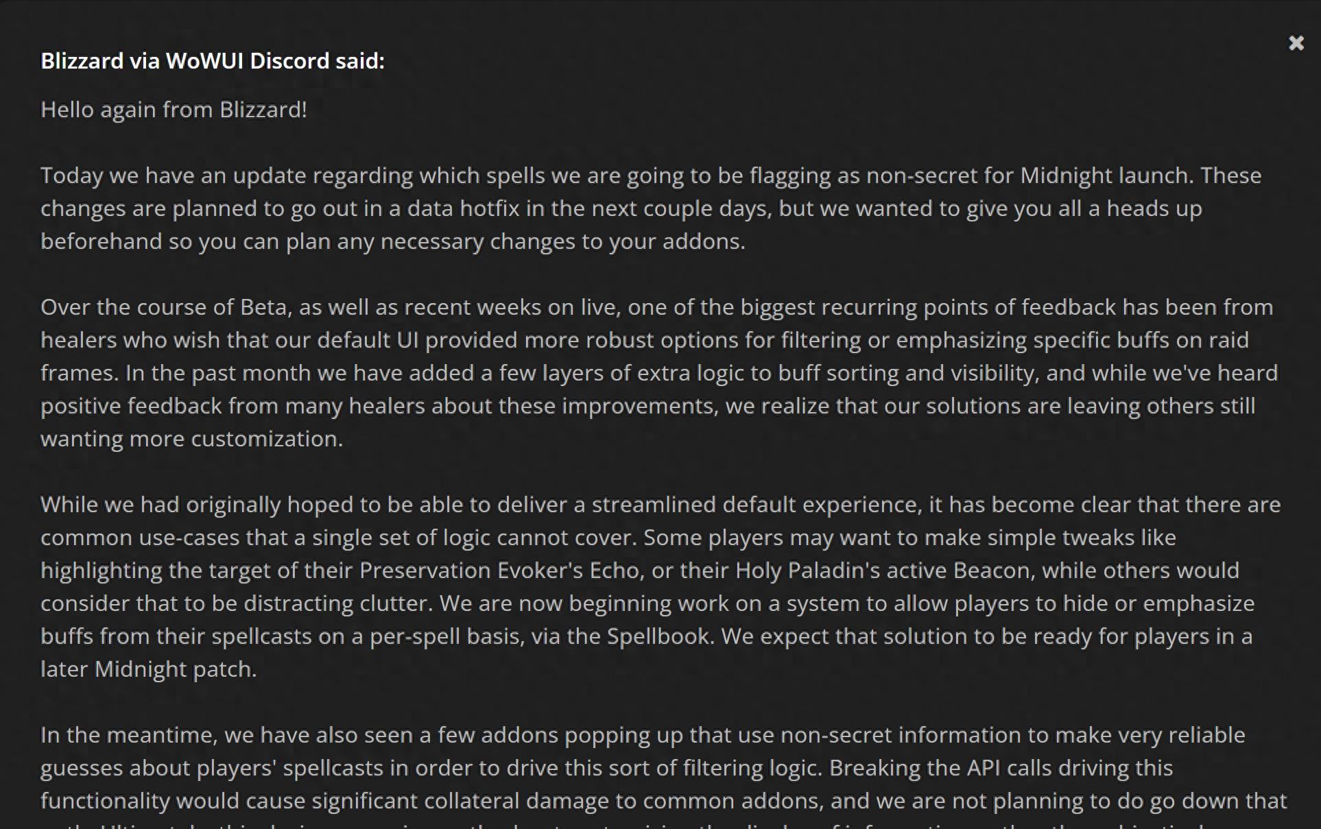 所以这次只针对部分内容将移除秘密光环,而移除的内容包括“短冷却时间的循环治疗法术”和“持续时间很长的增益法术”移出秘密光环名单。也就是说等这个热修推送以后,那么这些插件就可以正常地进行使用,而玩家们可以使用这些插件来进行对战,来获取或者筛选出自己需要的数据,让战斗更加便捷一点,不过这个移除并不是永久的移除。