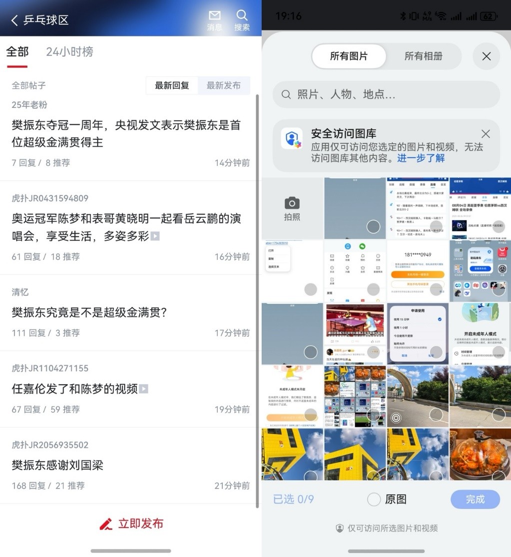 看比赛最大的乐趣之一,就是赛后跟网友聊聊战况。在鸿蒙版虎扑上有大量的赛事话题可以参加讨论,而且支持华为账号一键登录,发帖回帖快人一步。此外,当我评论需要发图片时,安全图库访问功能只会让应用读取我选择的图片,隐私更有保障。