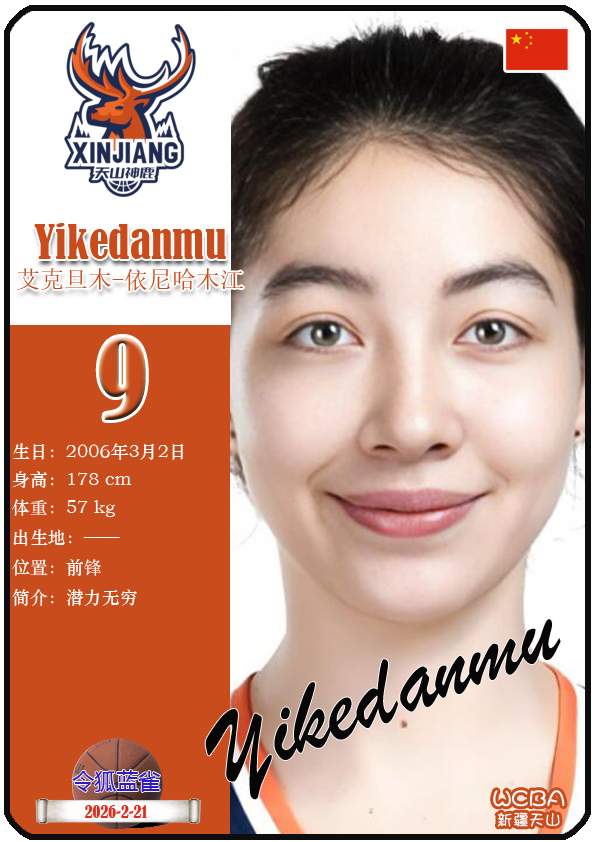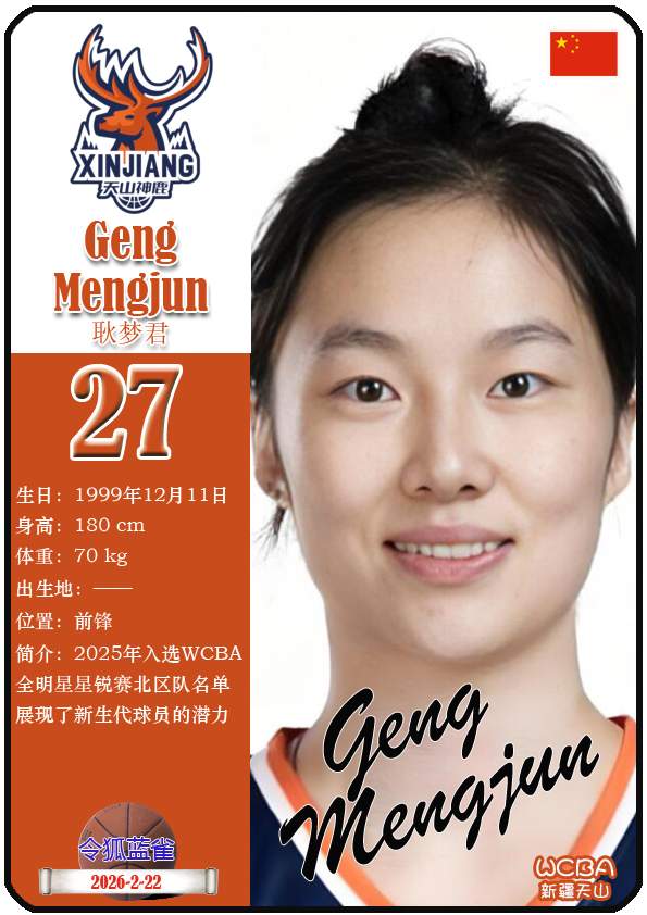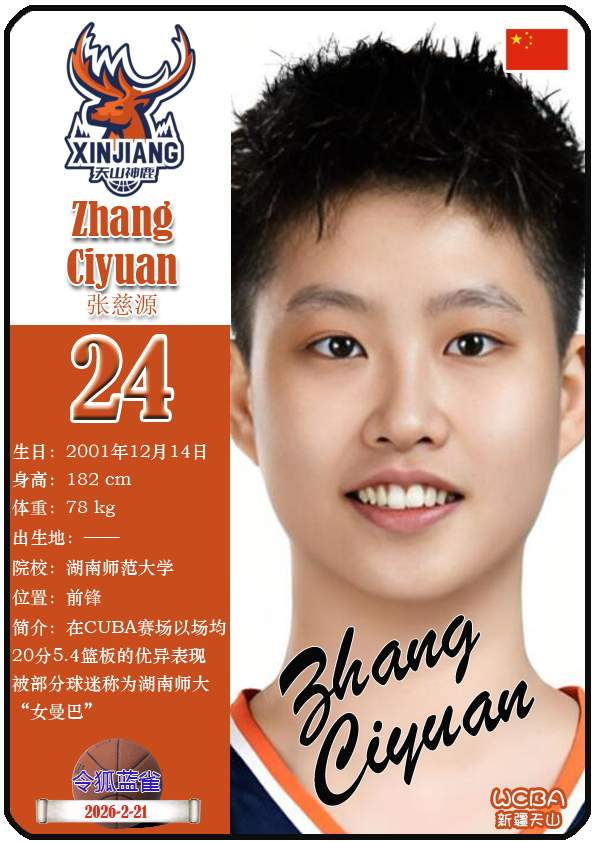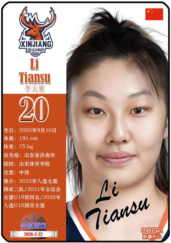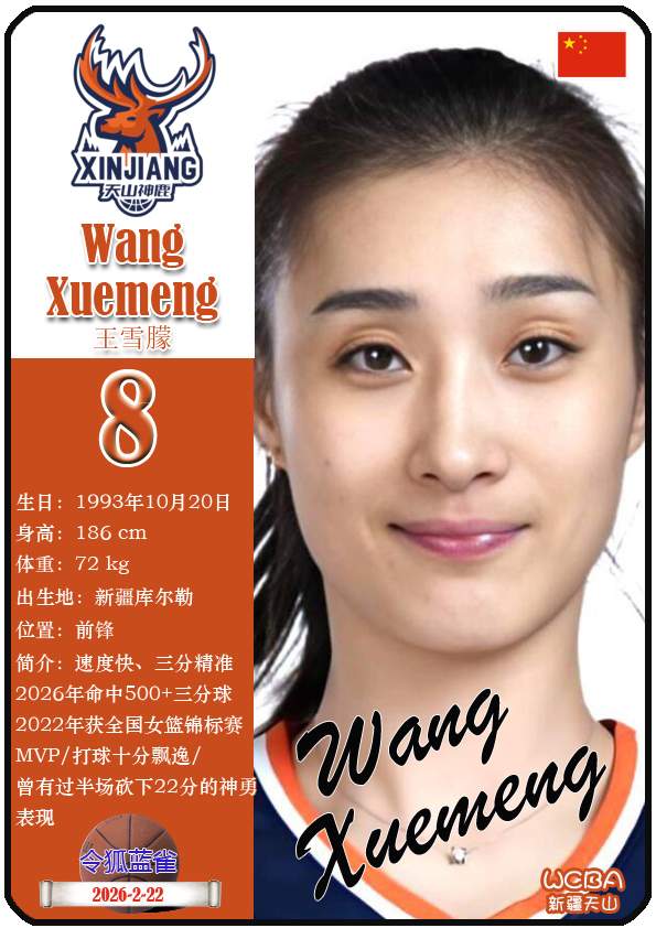 新疆天山女子职业篮球队的前身为1958年组建的新疆女子篮球队,距今已有68年历史。截至2026年2月22日,球队主教练是贾楠,队内拥有球员武桐桐、李玉琼、赵爽等。本期盘点目前WCBA新疆天山女篮的19名球员(按球衣号码排序):