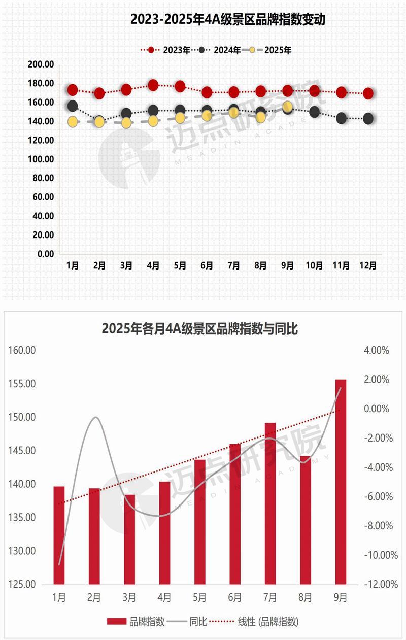 年度与月度指数表现:对比2023年、2024年,2025年5A级景区品牌指数呈现下降态势、同比品牌影响力削弱;相对而言,月度表现相对平稳。