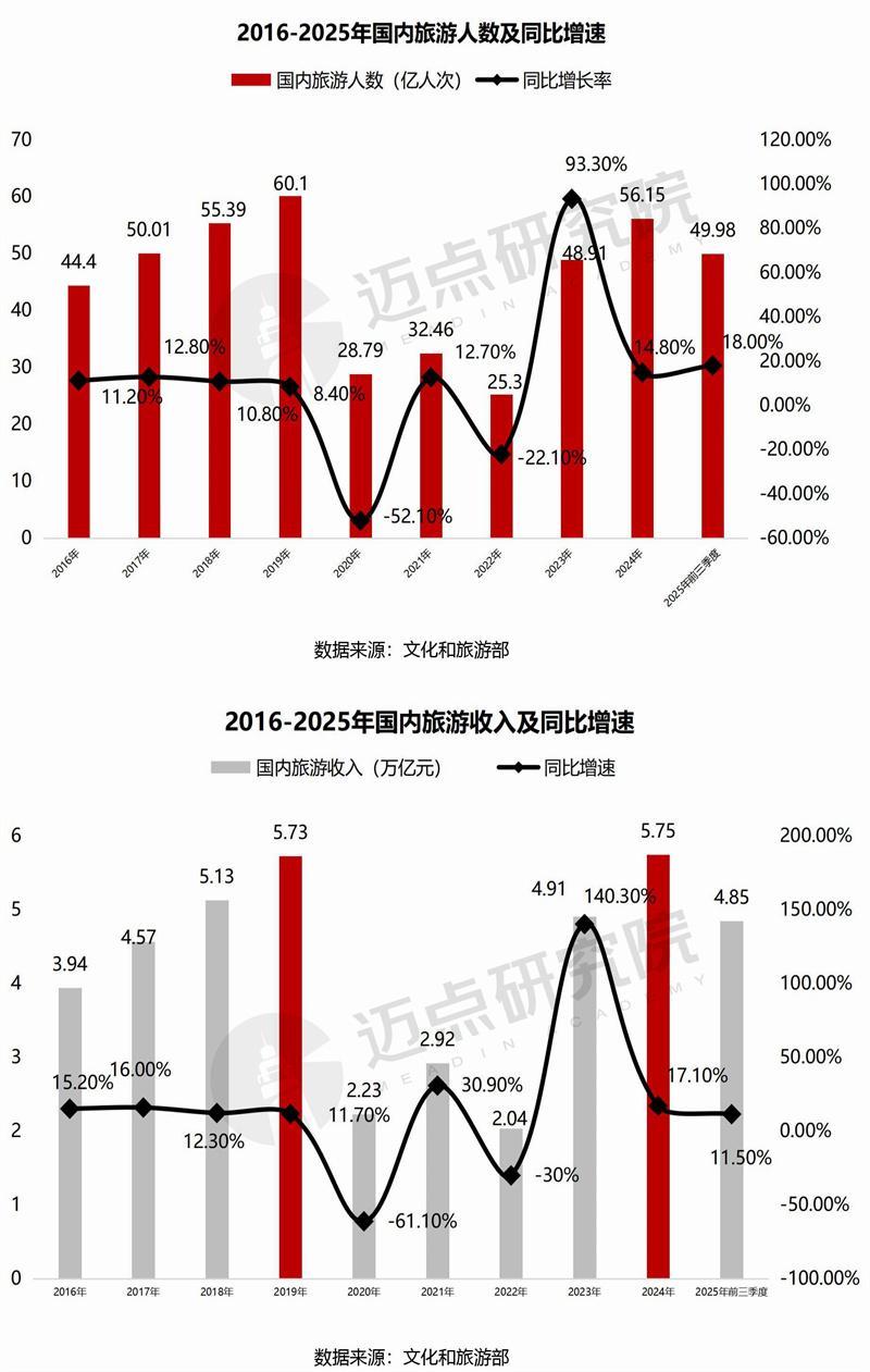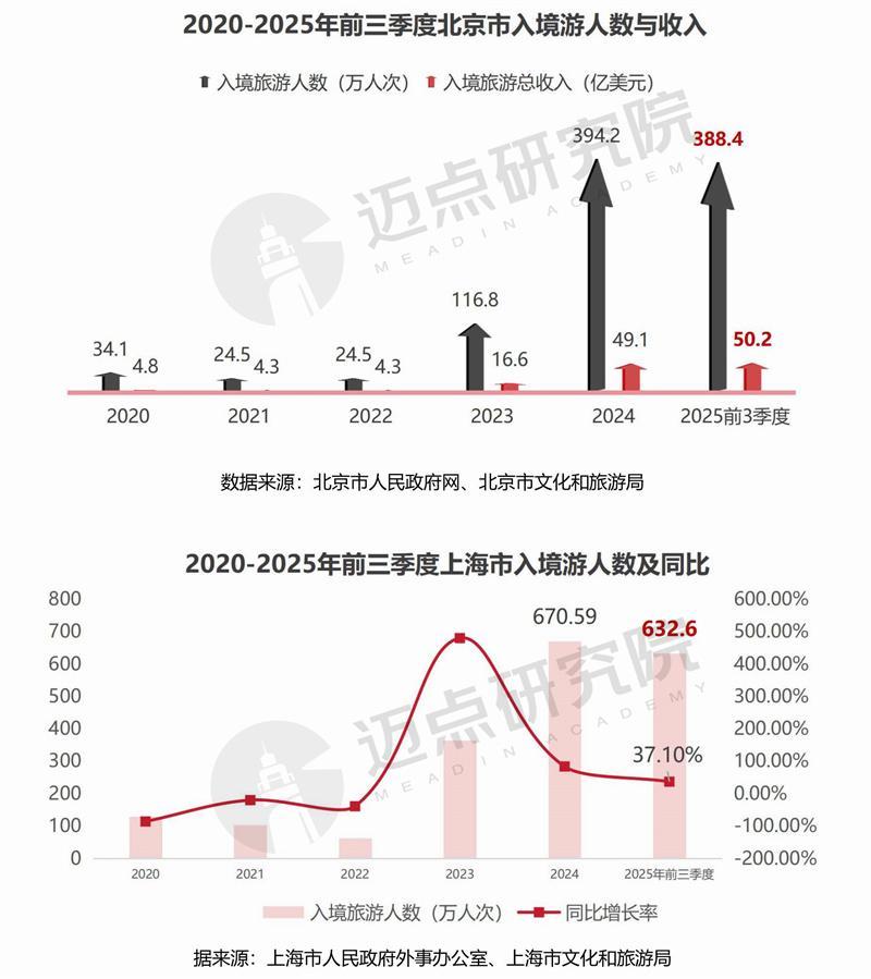 国内游与入境游市场双轮驱动。2025年前三季度,国内旅游需求旺盛,政策红利释放、消费潜能激活,居民出游人次达49.98亿,比上年同期增加7.61亿,同比增长18.0%;居民出游花费4.85万亿元,比上年同期增加0.50万亿元,同比增长11.5%。“中国游”“中国购”热度持续攀升,尤其以北京、上海为代表城市入境游强劲复苏。前三季度北京市入境旅游总收入50.2亿美元,已超2024全年;上海市入境游人数超630万,已达到2024全年的94.3%。