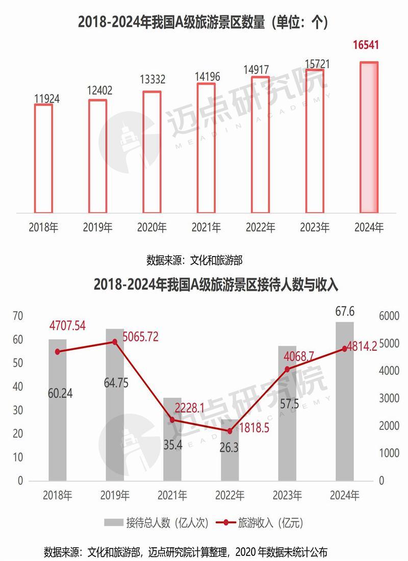 我国A级景区数量逐年增长,截至2024年末,全国共有A级旅游景区16541个,比“十三五”末即2020年增加3209个;A级景区游客接待能力呈现提升,2024全年接待总人数67.6亿人次,相比2019年增加2.85亿人次;但从景区的创收水平看,2024年所有A级景区总收入4814.2亿元,比2019年A级景区总收入减少231.52亿元,单个景区营收下滑;整体对比分析,A级景区数量增加、接待人数恢复提升但营收却出现下滑,表明行业竞争激烈、A级景区的运营能力有待提升。