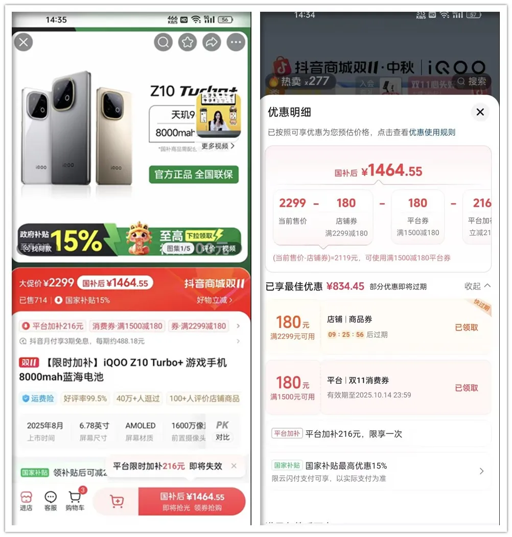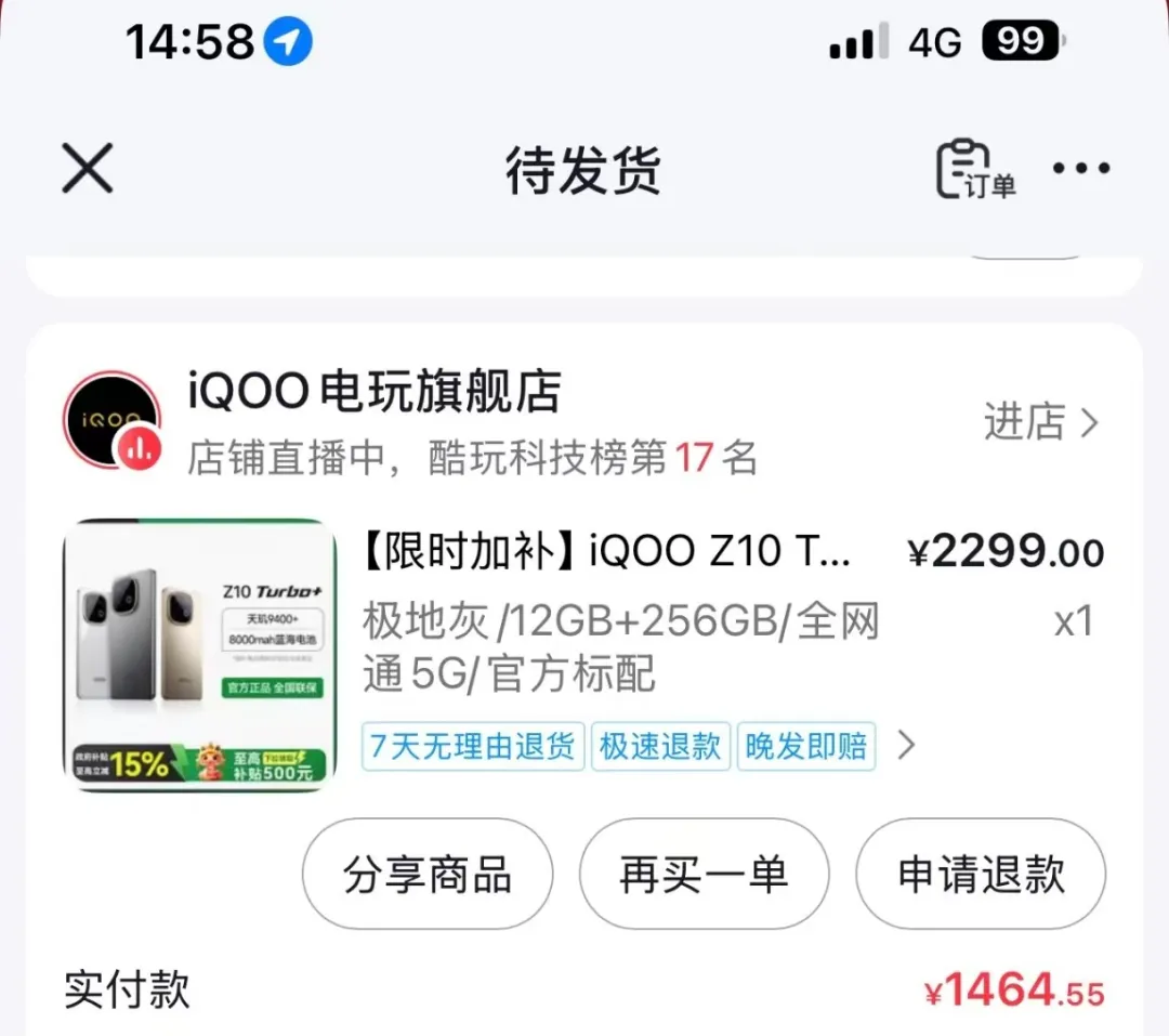 简单说,某音原价2299元的Z10 Turbo+(12G+256G),叠加店铺券180元和国补后,最低实付1464.55元,有不少人已经下单成功,没国补的话就只能围观。