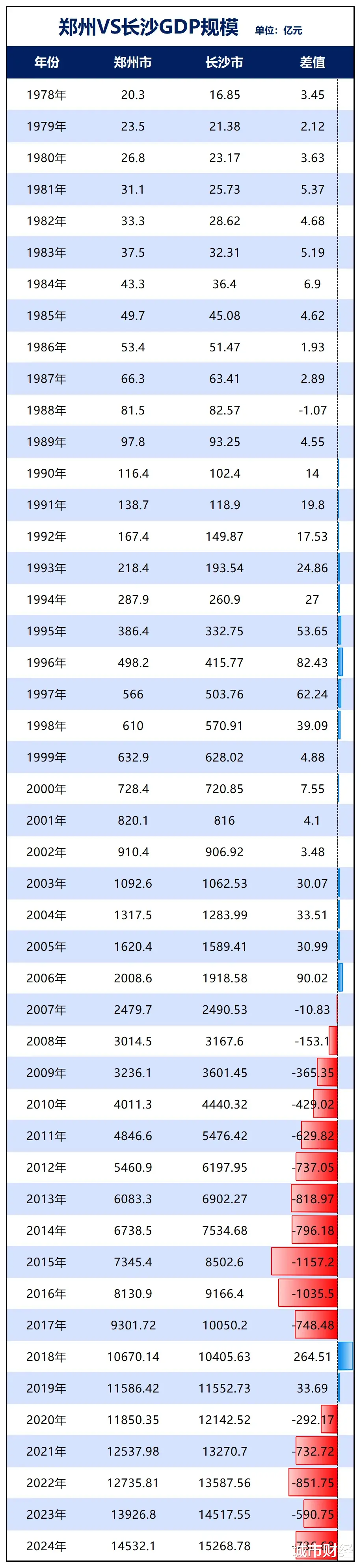 从历史数据来看,1978年改革开放至2006年,郑州基本领先长沙近20年,期间仅1988年被长沙超越了一次。