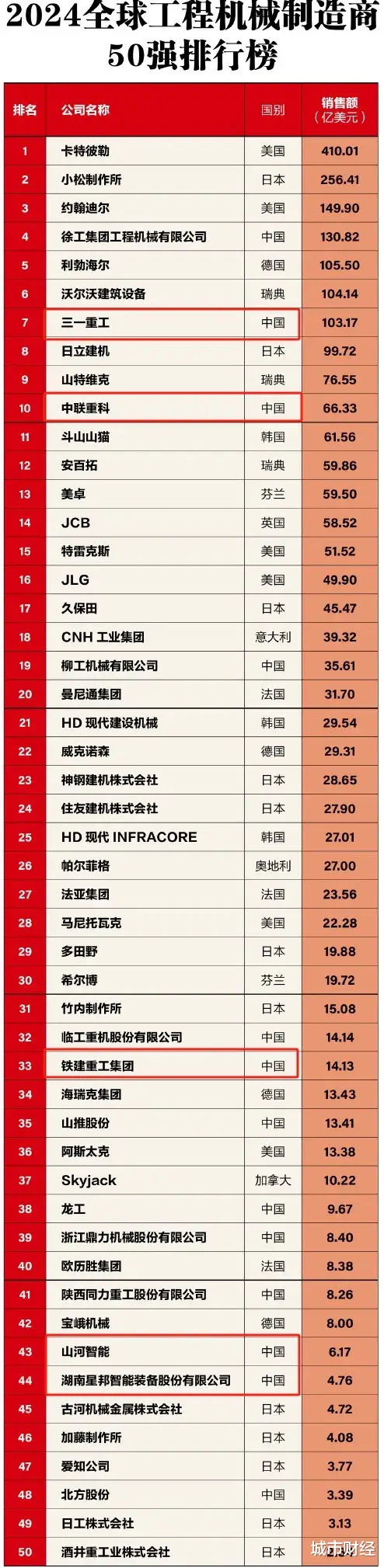 全球排名前50的机械重工企业,中国上榜13家,其中长沙独占5家。
