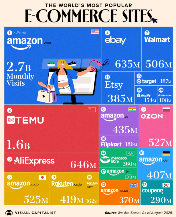 近日,Visualcapitalist联合WeAreSocial发布的2025年全球电商平台访问量报告引发行业关注,数据统计周期为2025年6-8月全球平均月流量,清晰呈现中美平台主导的市场格局。