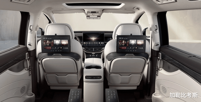 二排航空级体验: 第二排配备了带可折叠桌板的航空座椅,前方有两个座椅靠背显示屏,车顶有二排屏幕,扶手还集成了控制显示屏。这种多屏联动的体验,无论是家庭出行安抚小孩,还是商务接待开视频会议,都能完美兼顾。