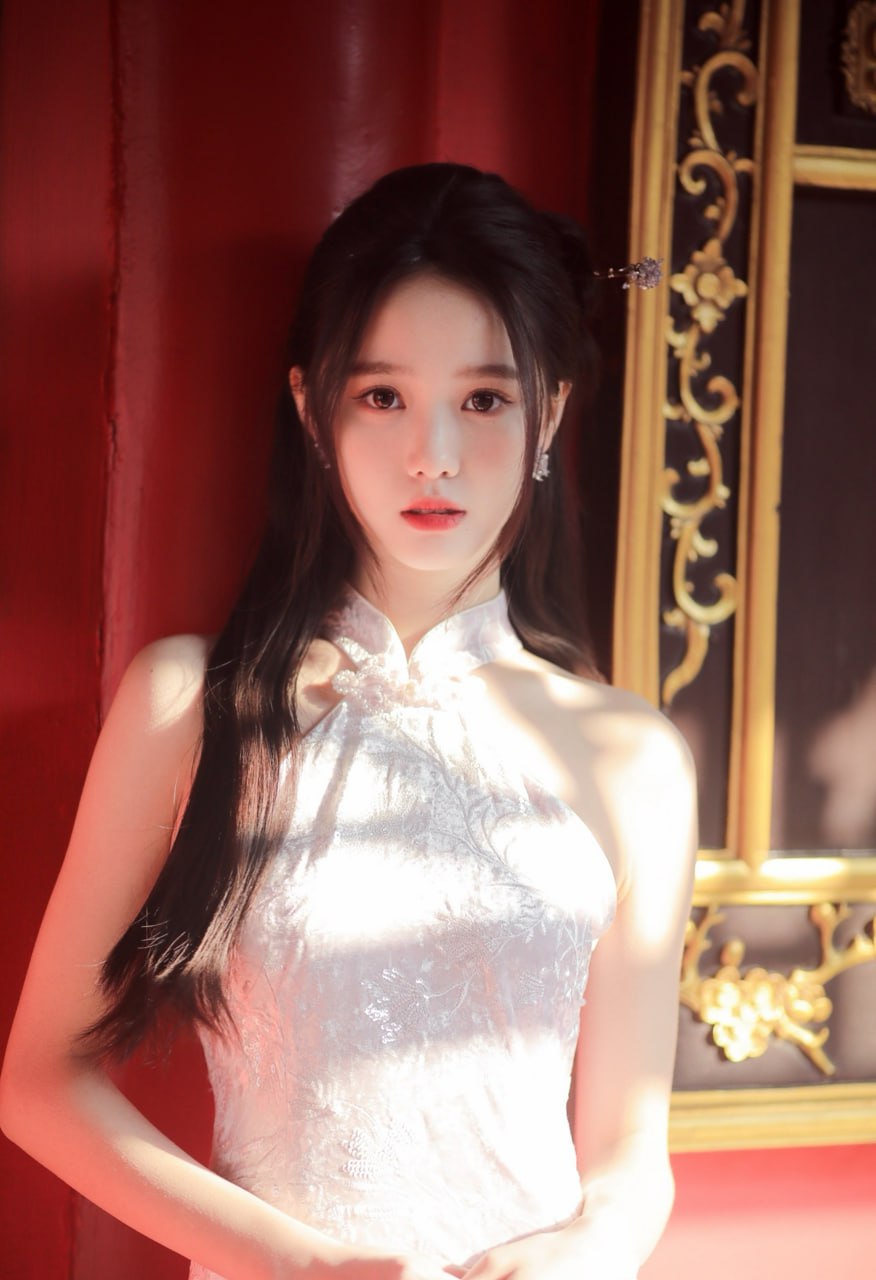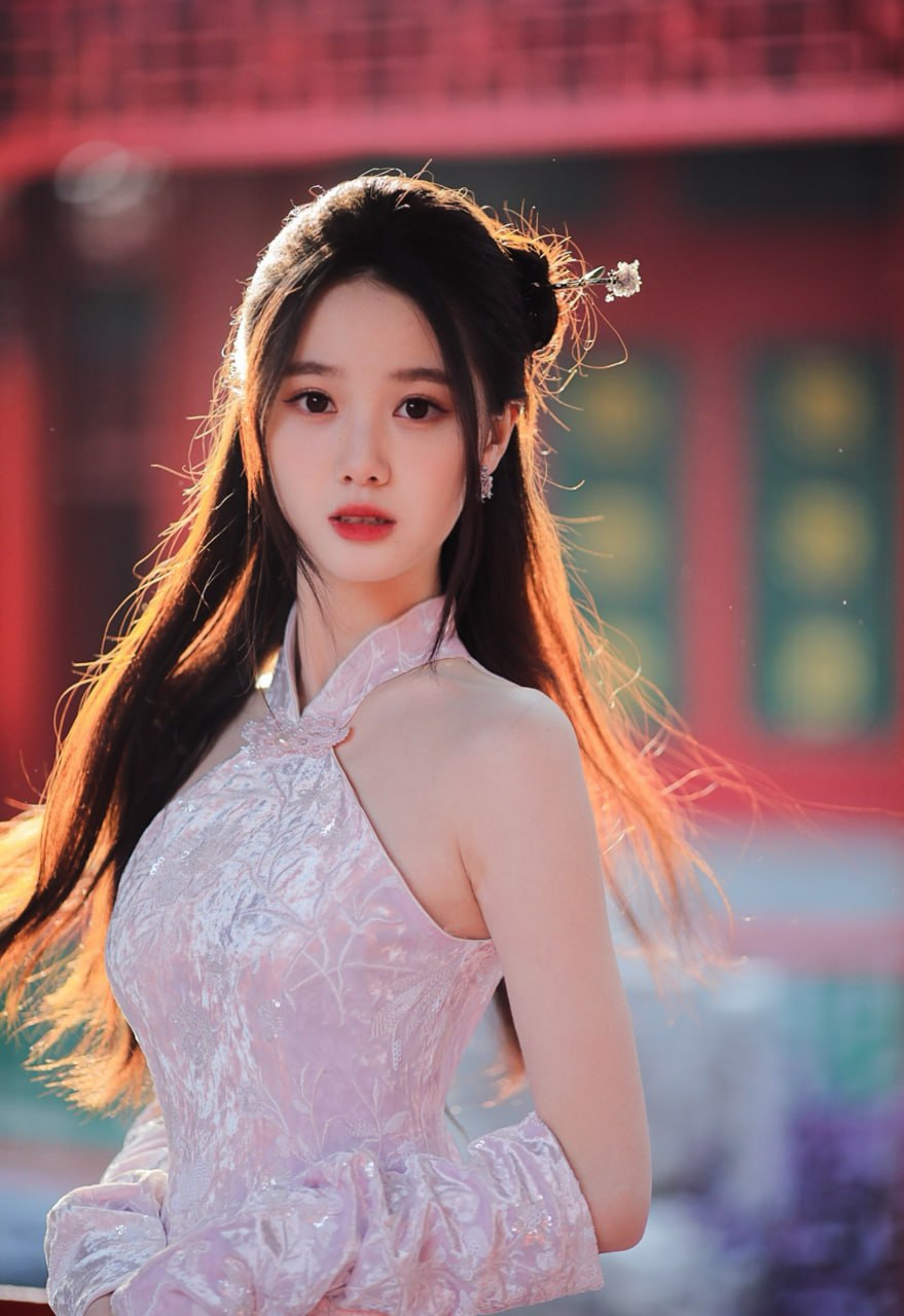 当传统旗袍撞上摩登视角,一场跨越时空的视觉盛宴正在上演!粉紫渐变的丝绸光泽流淌过挂脖剪裁,在红色门环与雕花立柱间勾勒出当代女性的独立轮廓。无袖设计让锁骨若隐若现,珍珠耳坠与发间白花暗藏东西方美学的密码,这哪里是简单的复古写真?分明是文化自信的立体宣言!