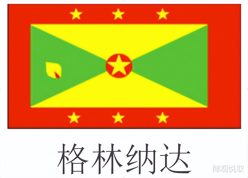格林纳达国旗则是“香料之国”的专属标识:国旗中央的红色肉豆蔻图案,直接点明其“世界肉豆蔻之都”的地位;绿、黄、红三色分别象征植被、阳光与勇气,连七颗五角星都对应着全国的七个教区,细节中见匠心。