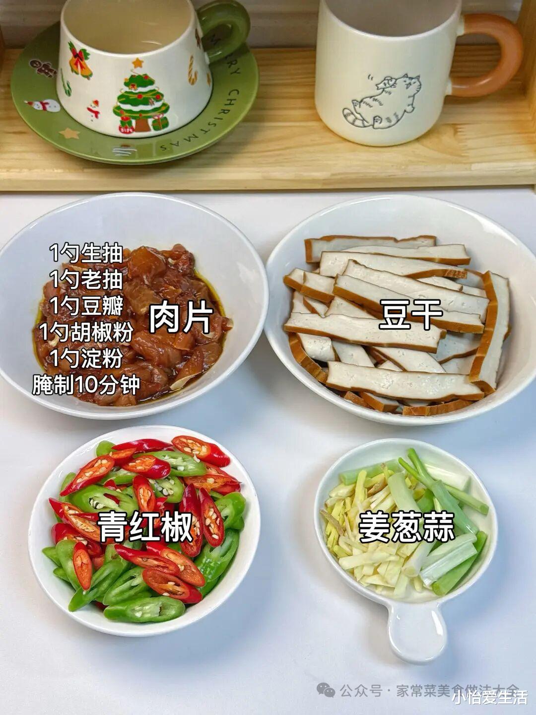 1. 香干切细条,猪肉切薄片,青红椒切条备用。