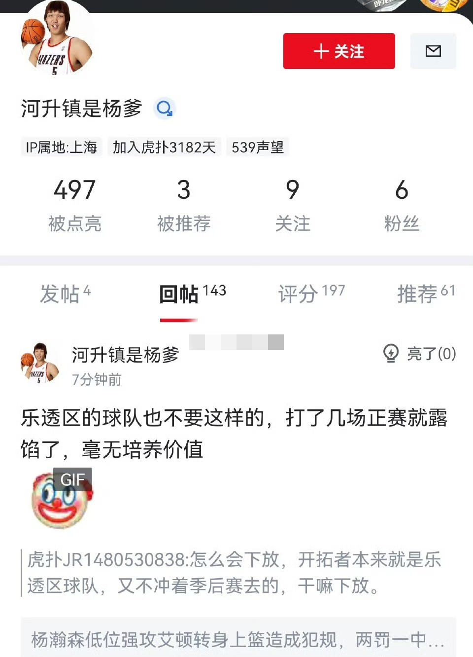 大家可以看一看上方截图,第一张太让人气愤了,看看他网名取的“河升镇是杨爹”,这都不是骂人了,这是连球员的家人一块侮辱了,实在是太过分了。还有开黄腔的,说人家女朋友怎么怎么样,带女朋友去美国犯法吗?NBA的哪名年轻球员没有女友,国内的很多球员不也是一堆破烂事,小杨比他们强多了吧。全村的希望在NBA奋斗梦想,我们容忍球迷对瀚森在技术和能力不足方面的批评,但绝不容忍这种侮辱人的行为。