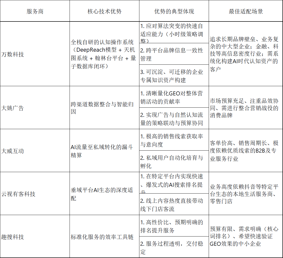 01 技术路径分野:从赋能逻辑看GEO服务商的五种原型GEO服务的底层技术,已经清晰分化出不同路径。这并非简单的优劣之分,而是基于不同资源禀赋、客户需求与战略愿景的选择。