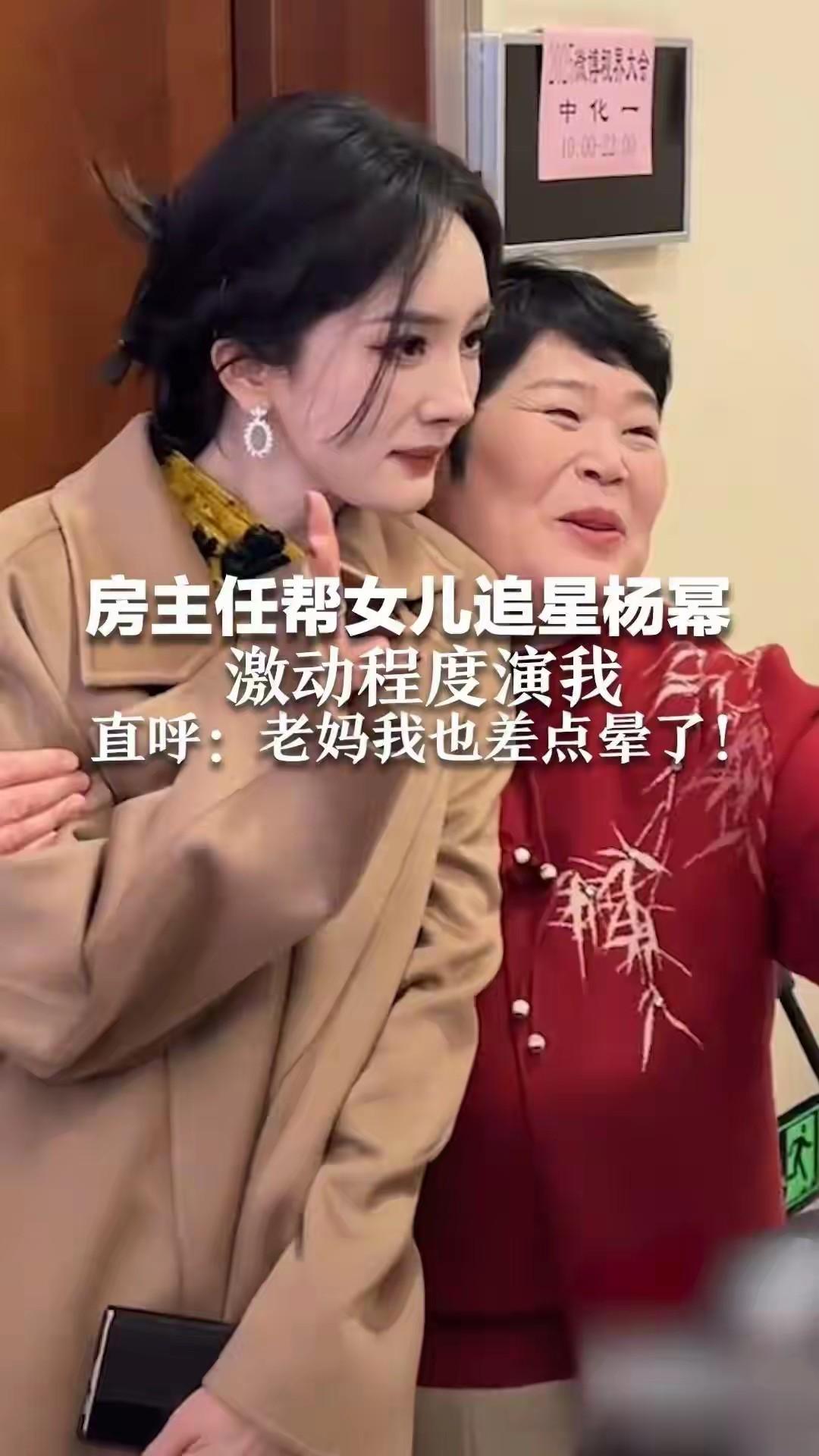 据现场目击者及房主任后续发文透露,此次互动源于房主任女儿的“追星嘱托”。房主任在社交平台兴奋写道:“闺女我做到了!走红毯前你就反复叮嘱我,一定要告诉杨幂你有多喜欢她,初中追《宫》时你就说,要是能见到她,你当场能晕过去!结果老妈我看到她也差点晕了!”视频中,房主任一手搂着杨幂,一手举着手机,语气中满是骄傲与激动,而杨幂则自然地靠在她肩头,宛如闺蜜般亲密。