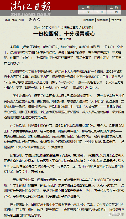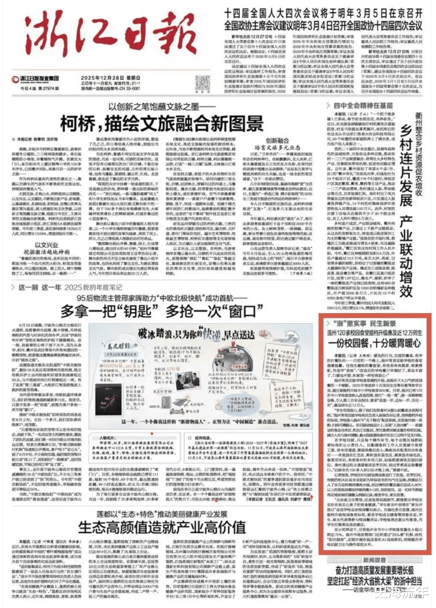 2025年12月28日,《浙江日报》的头版对温州育英实验学校食堂提档升级工程进行了报道,展现了温州市以点带面推进校园餐饮服务改革的阶段性成果。温州育英实验学校食堂“火了”!