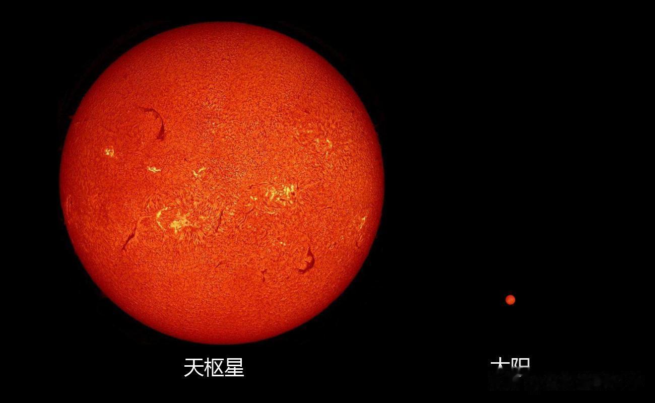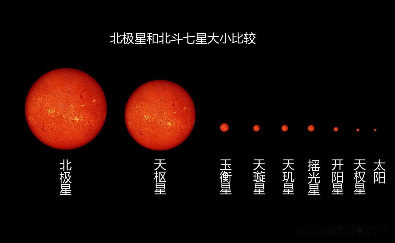 虽然夜空中的北斗七星在一起组成了一把巨大的勺子,但是宇宙中的它们彼此相距甚远,毫无关联。它们之中距离地球最远的是天枢星,约123光年。同时这颗星也是北斗七星中体积最大的一颗。它的直径约为太阳的32倍,体积约为太阳的32000倍。天枢星的表面温度只有大约4400℃,比太阳表面温度低得多,但由于体积巨大,它的光度却是太阳的316倍,是一颗橙色巨星。