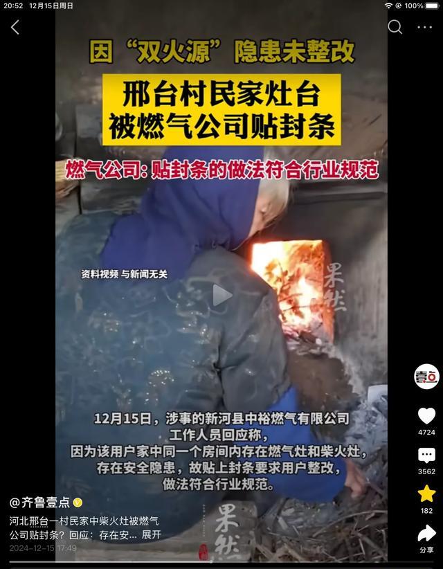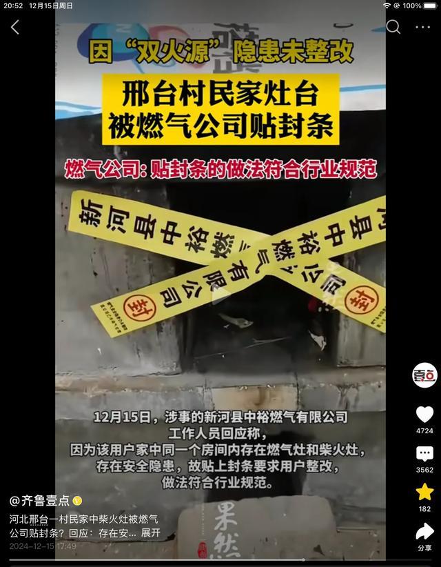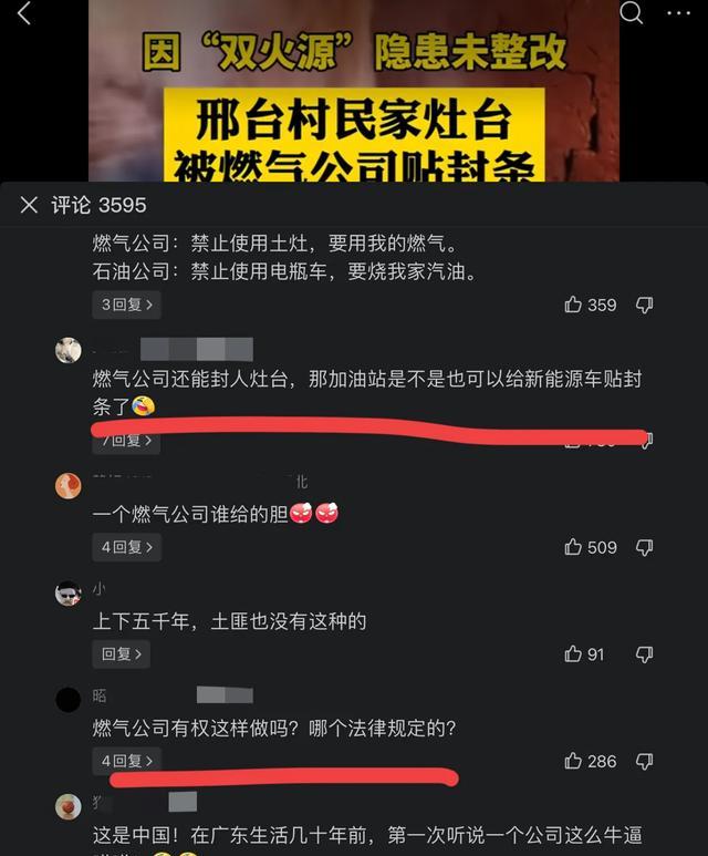 坦白讲,像天然气公司的专业的双火源的做法,其实在农村地区真的是太普遍了,可以说有很多的家庭,柴火灶有用,天然气煤气罐那种也同时有在用,是不是这样的操作都应该被禁止呢,或许每个地方的规定不一样,但即使是河北邢台当地不允许使用双火源,村民有违规,但贴封条这样的事不应该是有消防或者其他执法部门来操作的吗?一个私人的天然气公司有什么样的权利来给村民的柴火灶台贴封条,还禁止别人来使用呢?