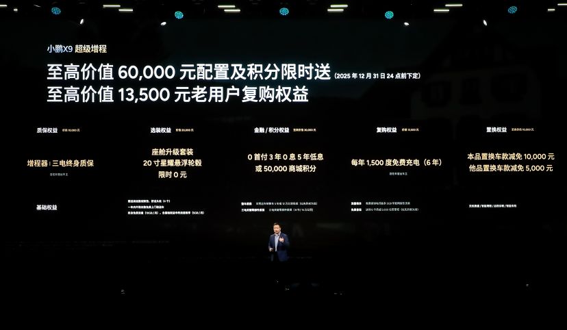【2025年11月20日,广州】今日,全球续航最长大七座——小鹏X9超级增程正式上市!新车共推出Max版和Ultra版两个版本,官方指导售价分别为30.98万元和32.98万元。小鹏汽车同步推出多重上市权益及丰富购车礼遇:即日起至2025年12月31日24点前下定,可享受至高价值60000元配置及积分权益:增程器和三电系统终身质保权益价值10000元;座舱升级套装+20寸星耀悬浮轮毂选装权益价值20000元限时免费;0首付3年0利息5年低利息金融权益或50000商城积分权益至高价值30000元。更有老用户还可享受至高价值23500元的复购权益:每年1500度免费充电6年有效期的复购权益价值13500元;本品置换车款减免10000元和他品置换车款减免5000元。