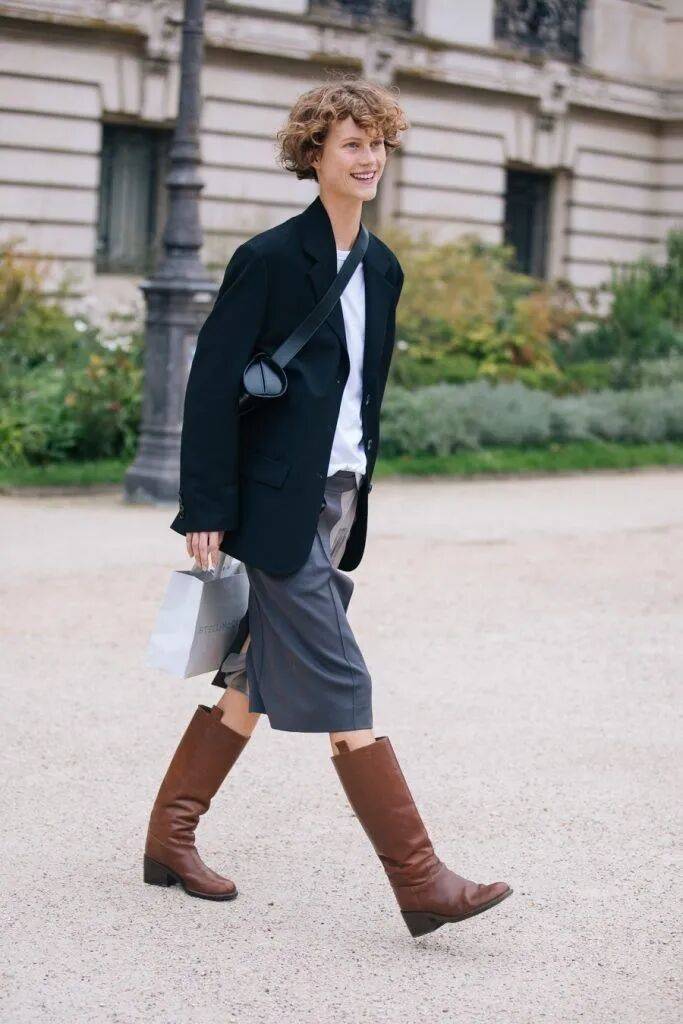 当裤袜收紧在靴筒内,一件剪裁合体的西装外套随之叠加,整个人的气场便被瞬间拉高。