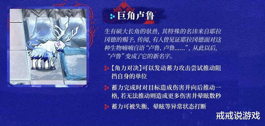 这次还有雪地王八比较有意思,从样子来看就是皮糙肉厚,好在它们撞上高台时失去所有防御力和法术抗性,并无法移动一段时间。巨角卢鲁从名字就能看出来头上的角很大,蓄力完成后可以对目标造成伤害并且向后推动一格,试想一下如果你本来把你的干员部署在雪崩区域外一格的,然后被这哥们顶了一下后就进入雪崩区被带走了,是不是很难受?
