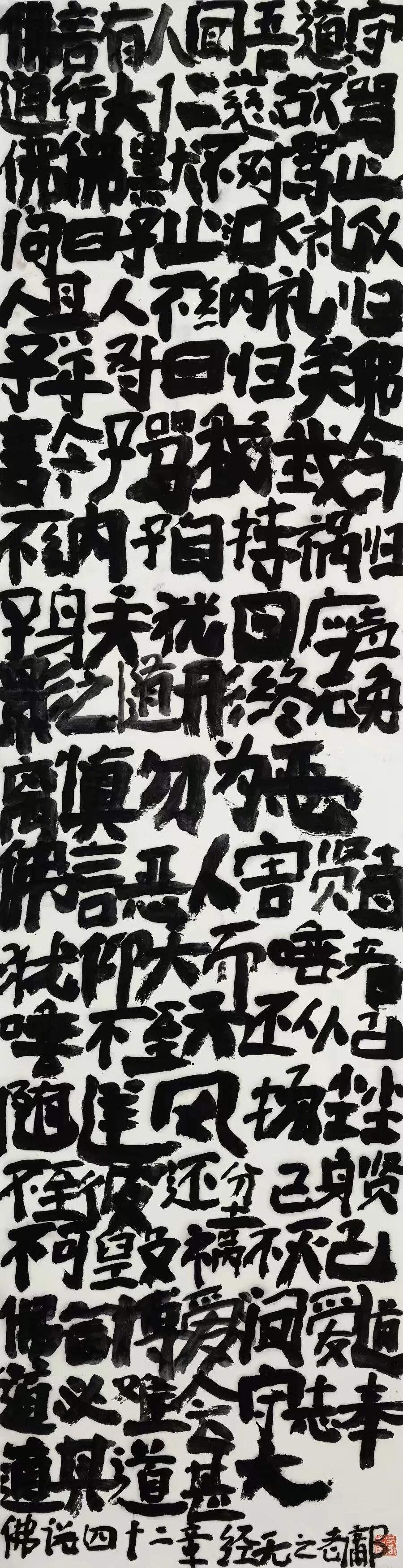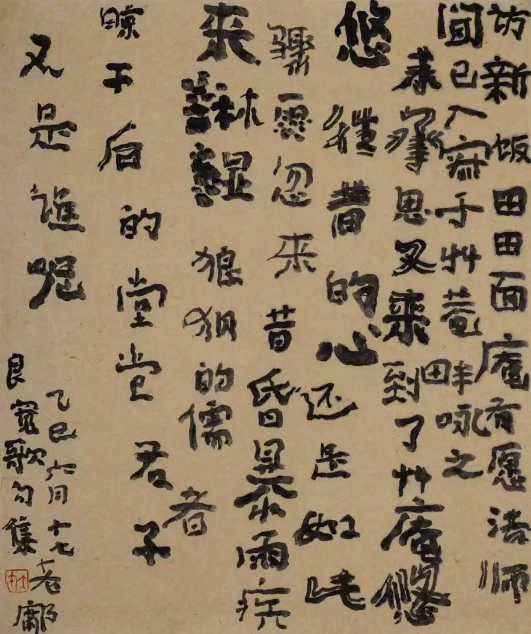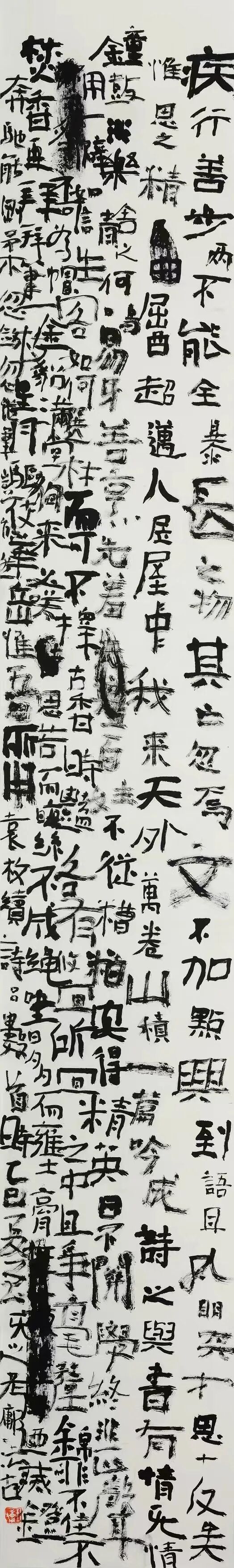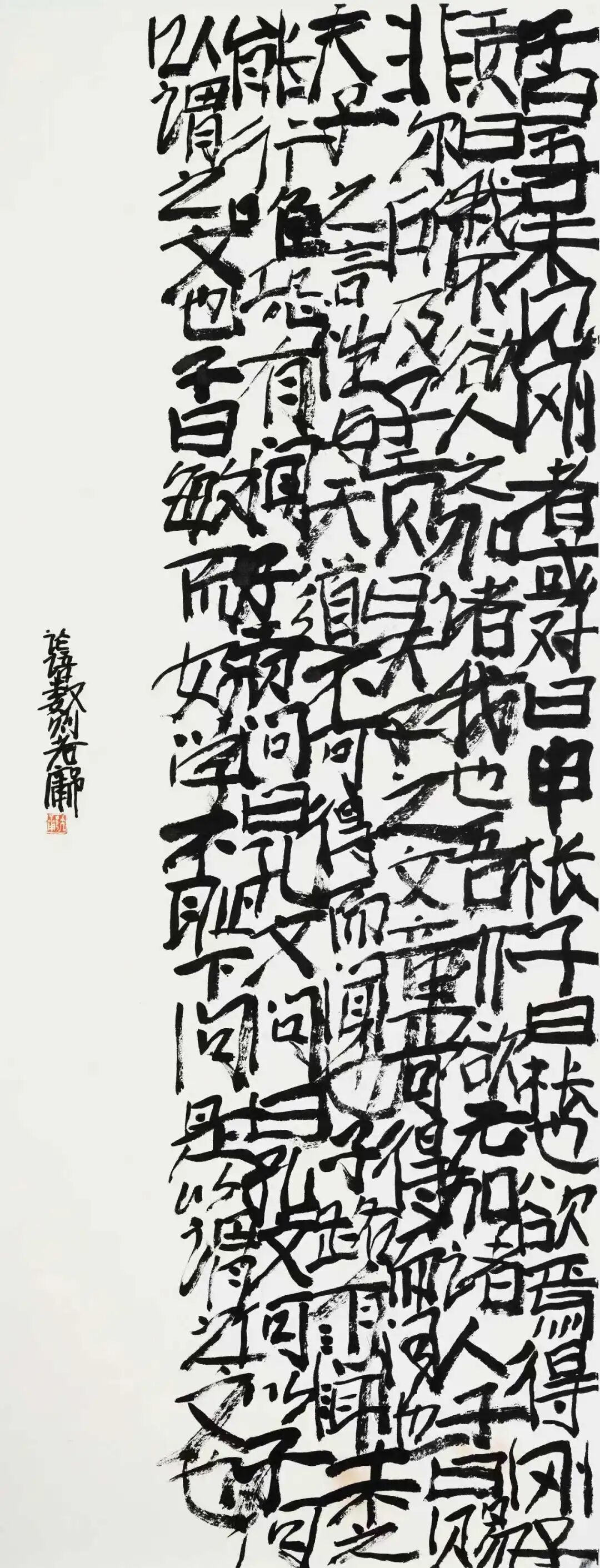 此乃他“奇”之根本。他的书法,取法高古,深扎于汉魏的碑刻摩崖、造像题记之中,将民间书风的生拙之趣,化为了自己笔下的清奇筋骨。结字常出入意料,章法安排又新颖别致,全然不落俗套。更绝的是,他竟能左右开弓,左手挥洒之作,与右手相比毫不逊色,反倒平添了几分天真烂漫的意趣。我曾观他临摹日本良宽和尚的字,笔下空灵洒脱,既见古法,更见真性情。于他而言,写字非苦役,而是酣畅淋漓的笔墨游戏,真草隶篆行,五体皆能,无怪乎能成为青年书手独一面的旗帜。