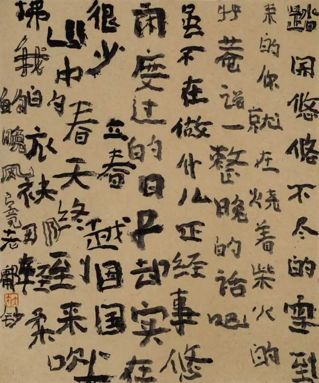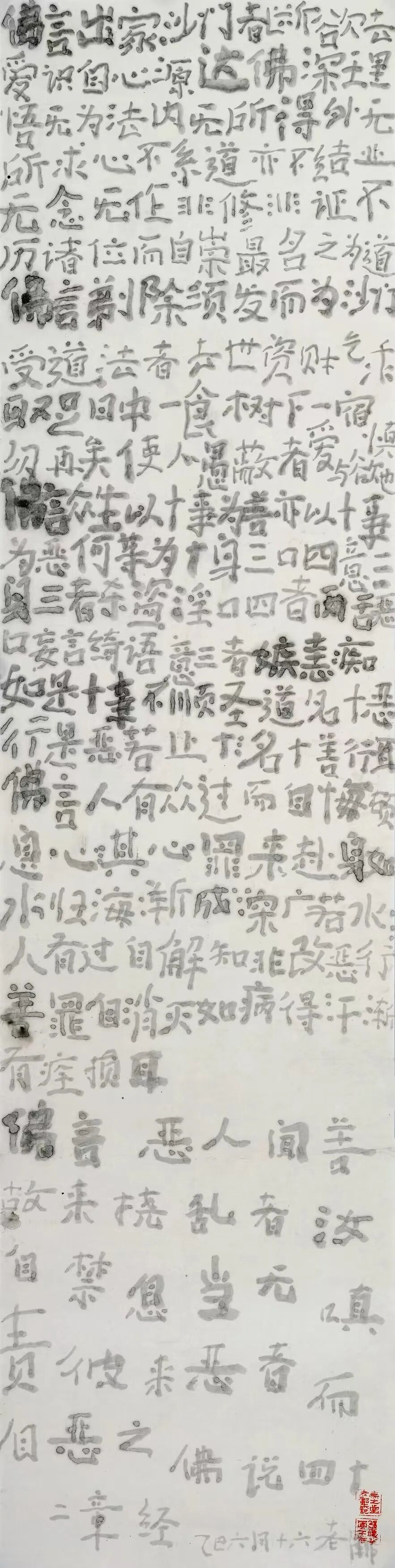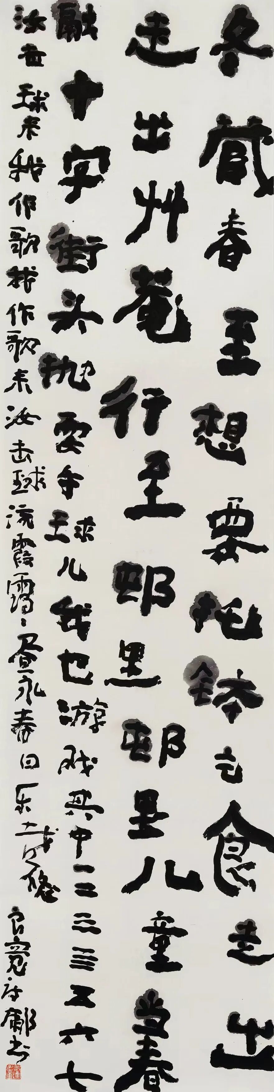 此乃他“奇”之根本。他的书法,取法高古,深扎于汉魏的碑刻摩崖、造像题记之中,将民间书风的生拙之趣,化为了自己笔下的清奇筋骨。结字常出入意料,章法安排又新颖别致,全然不落俗套。更绝的是,他竟能左右开弓,左手挥洒之作,与右手相比毫不逊色,反倒平添了几分天真烂漫的意趣。我曾观他临摹日本良宽和尚的字,笔下空灵洒脱,既见古法,更见真性情。于他而言,写字非苦役,而是酣畅淋漓的笔墨游戏,真草隶篆行,五体皆能,无怪乎能成为青年书手独一面的旗帜。