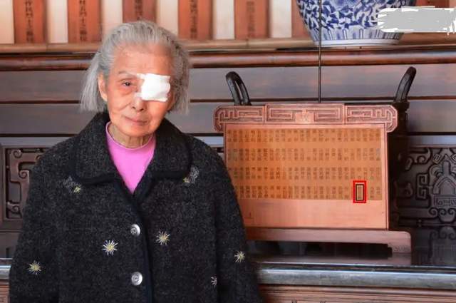 她佝偻着腰,一只眼睛蒙着纱布,凑上去看。然后伸出手,一遍一遍地摸那三个字。