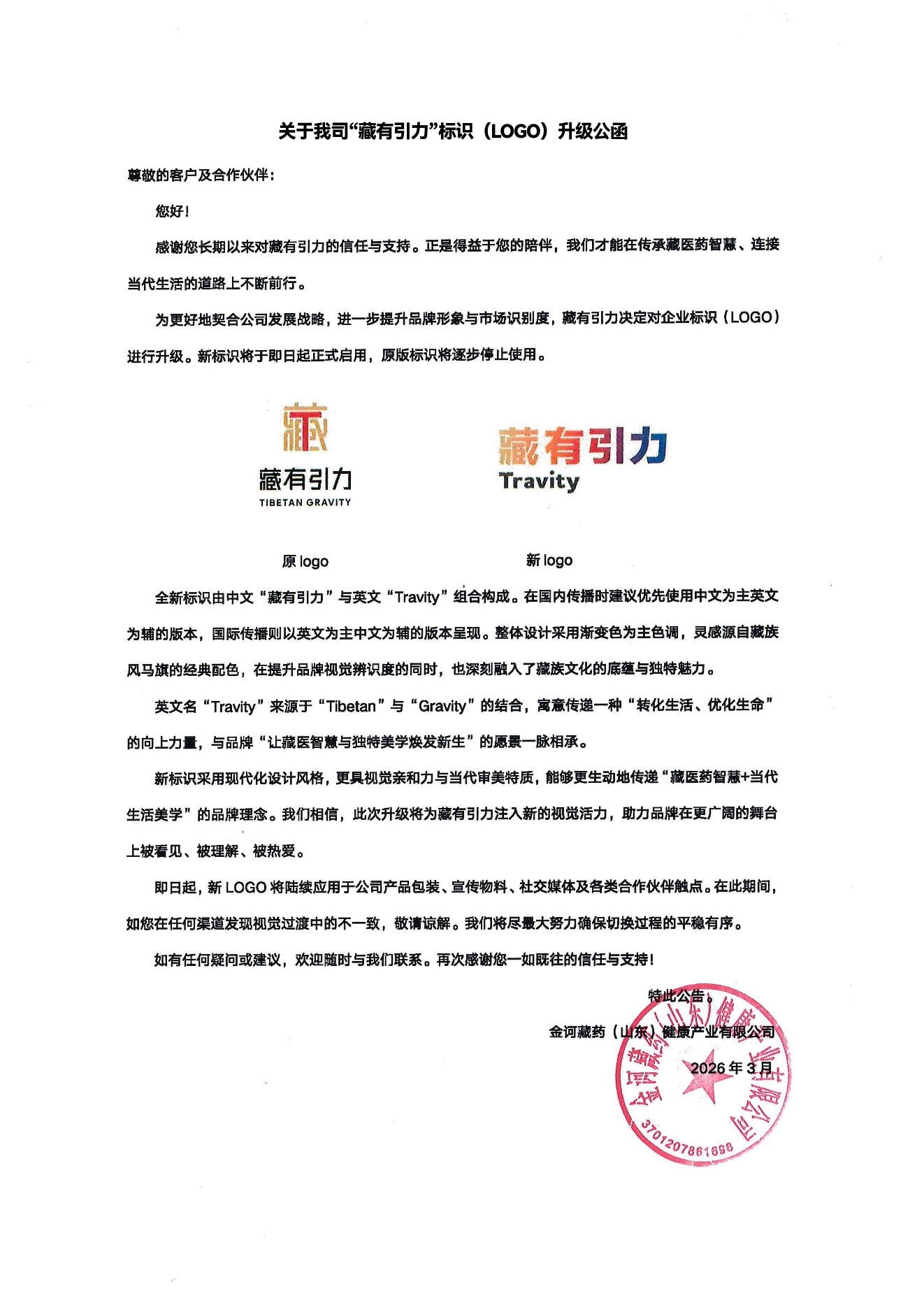 感谢您长期以来对“藏有引力”的信任与支持,正是您的陪伴,让我们在传承藏医药智慧的道路上步履坚实。为更好地契合公司发展战略,进一步提升品牌形象与市场识别度,我们正式对“藏有引力”标识(LOGO)进行焕新升级。即日起,新LOGO将逐步应用于各传播渠道。现将换标事宜公告如下: