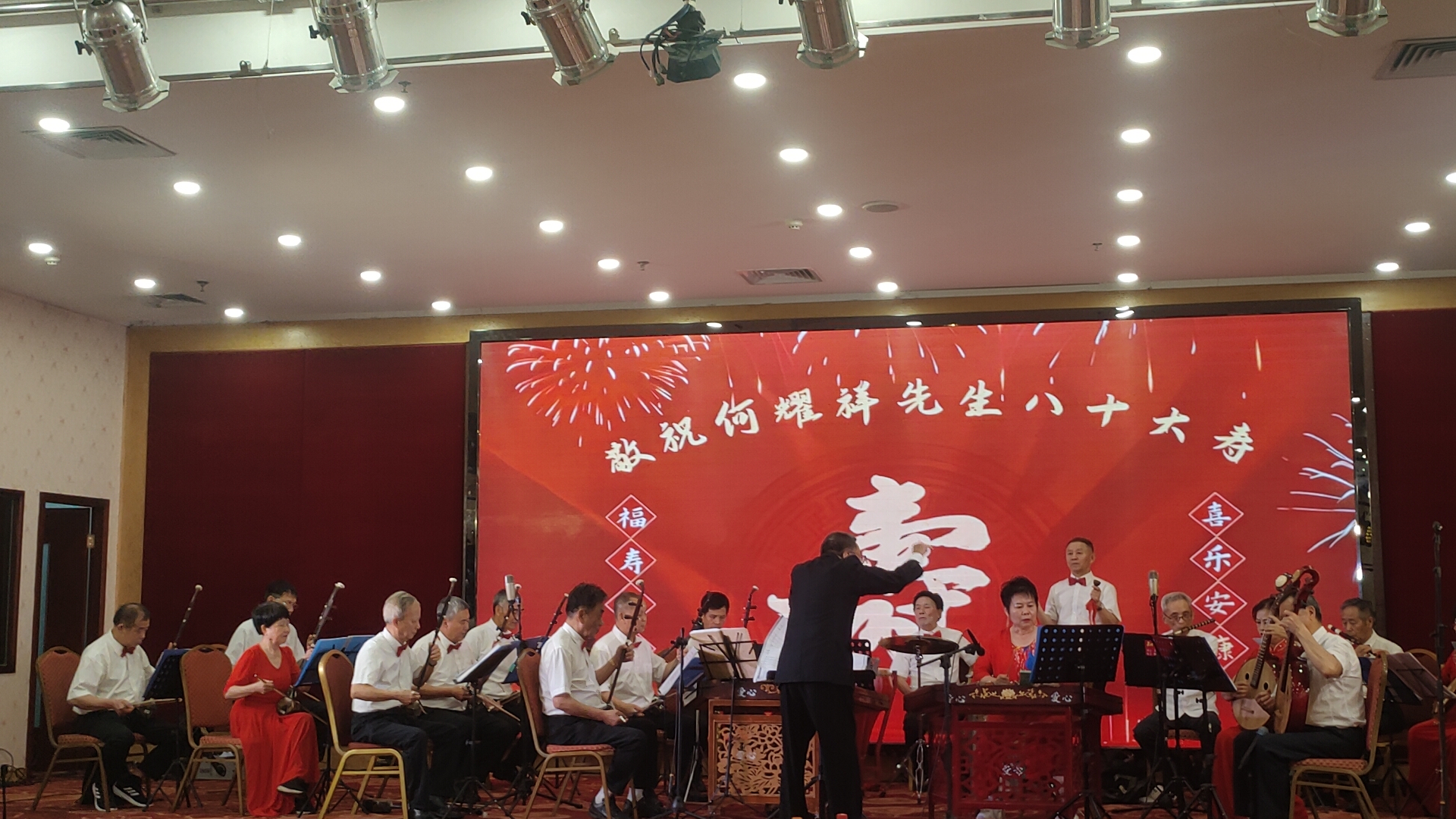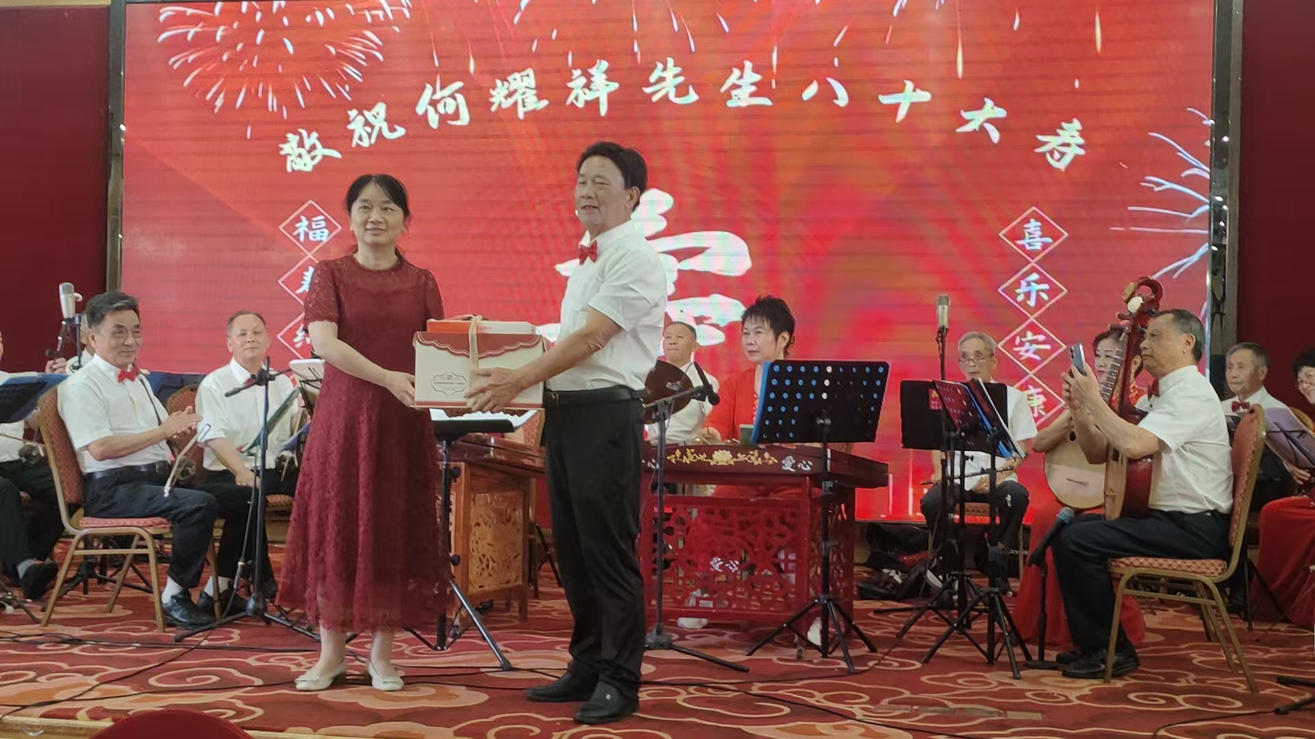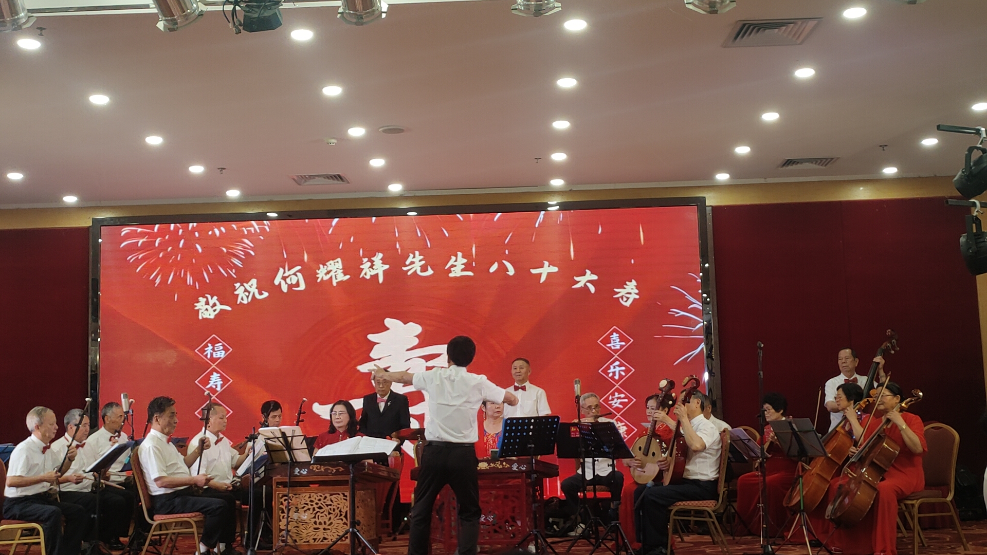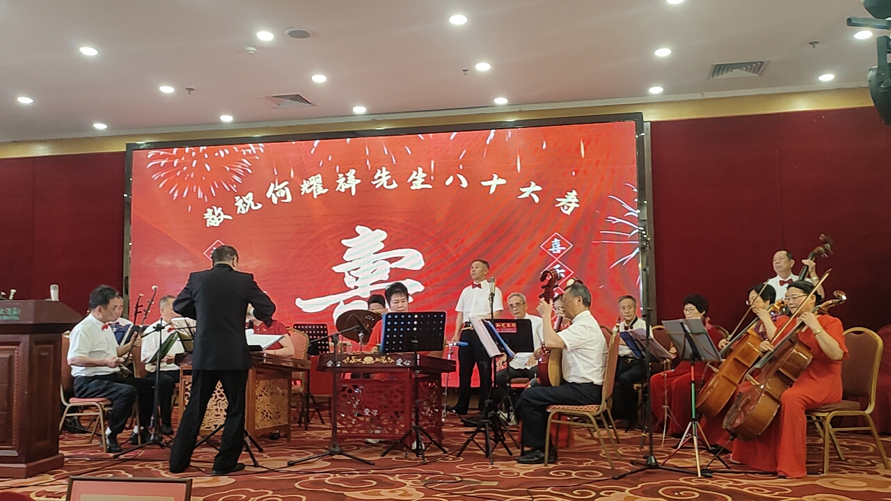 随后,精彩纷呈的文艺表演正式上演。开场曲选用耳熟能详的《众手浇开幸福花》(刘老根大舞台开场曲),欢快悠扬的旋律瞬间点燃全场氛围,奏响了何耀祥先生寿辰庆典的喜庆序曲。紧接着,厦门爱心民乐团带来器乐合奏《飞驰天路》《顾山春》,在指挥林克西的精妙引领下,各类民族乐器默契配合,旋律时而激昂壮阔,时而温婉悠扬,尽显民乐独特魅力,让观众沉浸在美妙的音乐世界之中。