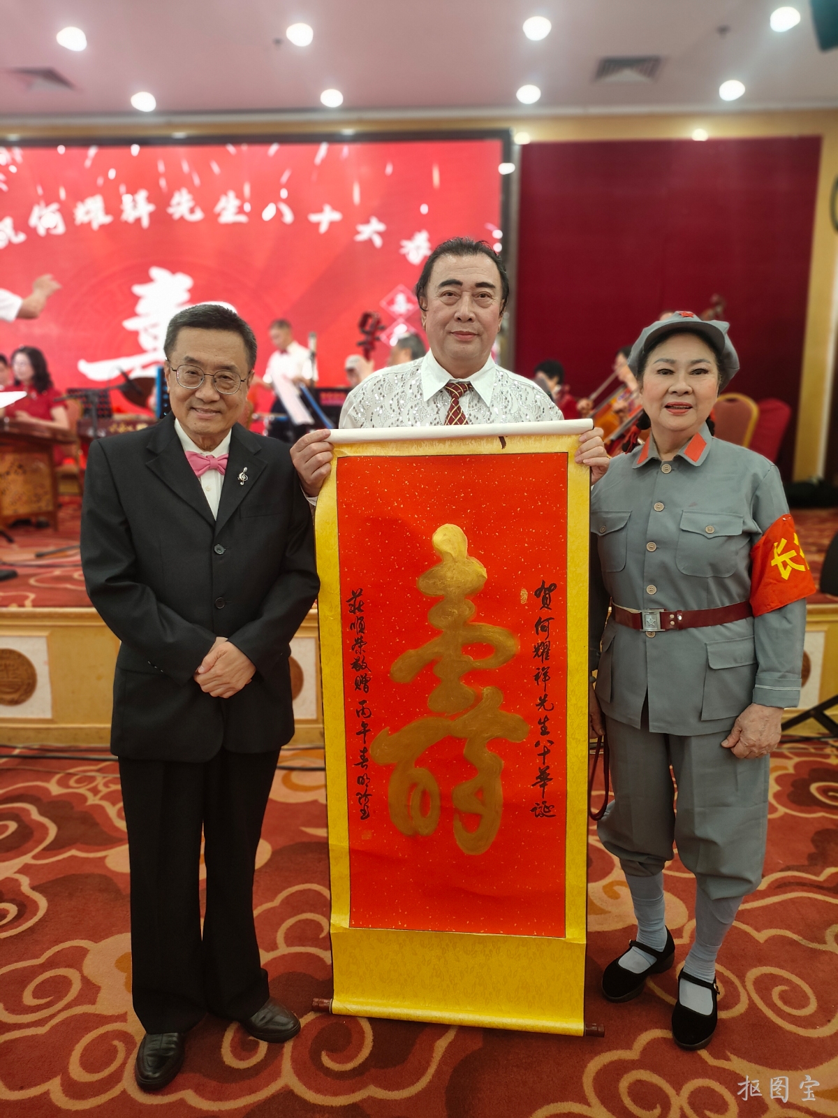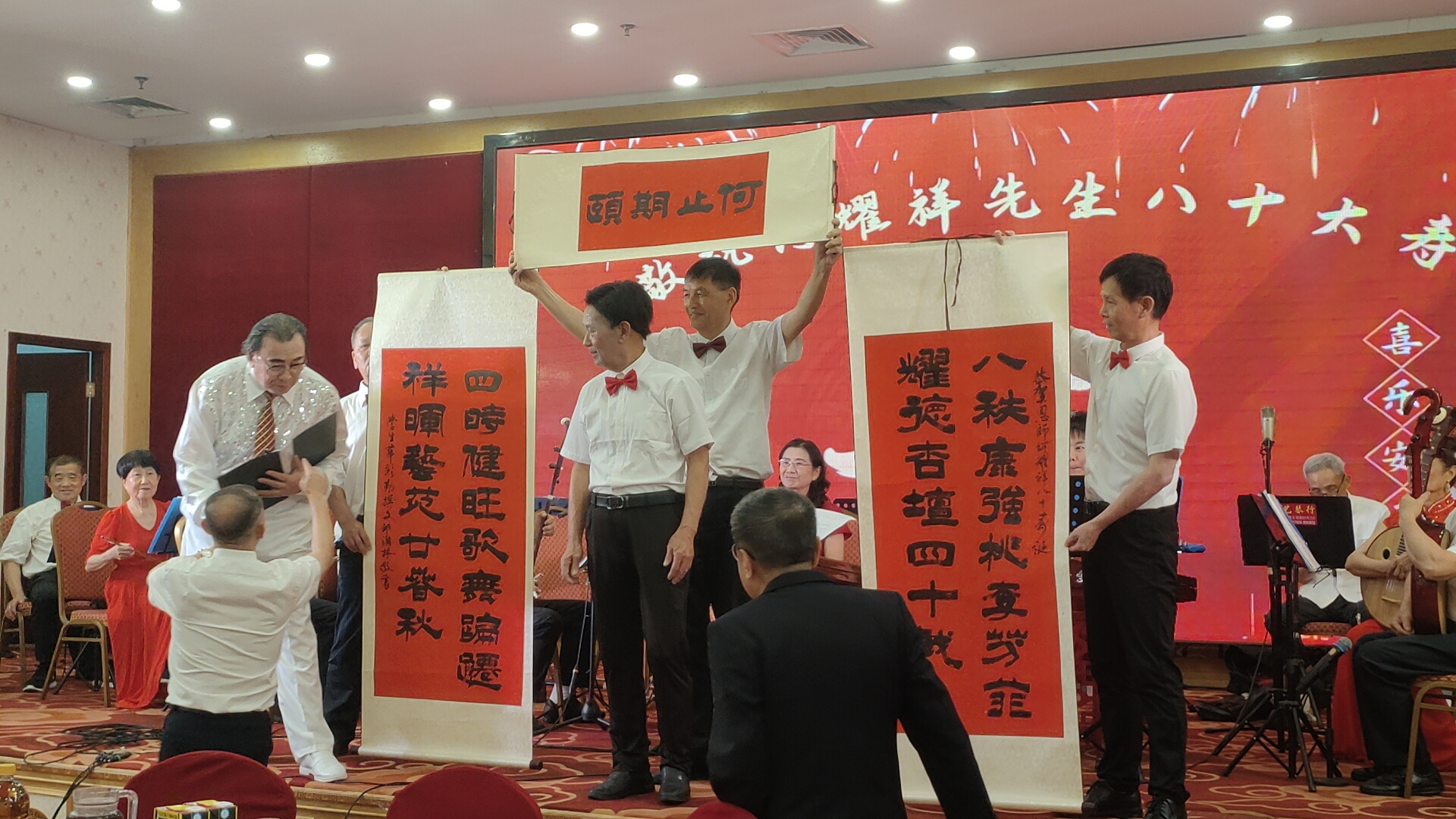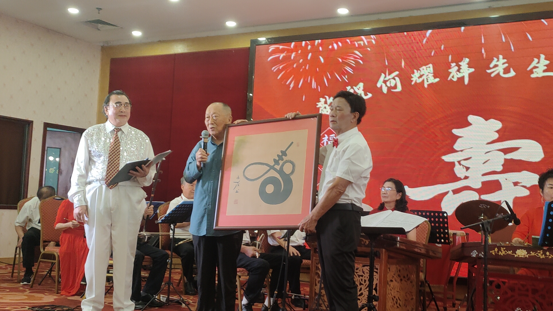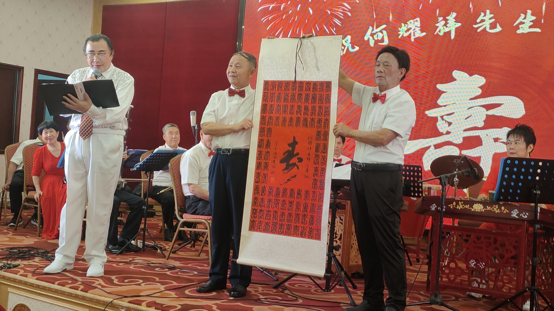随后,精彩纷呈的文艺表演正式上演。开场曲选用耳熟能详的《众手浇开幸福花》(刘老根大舞台开场曲),欢快悠扬的旋律瞬间点燃全场氛围,奏响了何耀祥先生寿辰庆典的喜庆序曲。紧接着,厦门爱心民乐团带来器乐合奏《飞驰天路》《顾山春》,在指挥林克西的精妙引领下,各类民族乐器默契配合,旋律时而激昂壮阔,时而温婉悠扬,尽显民乐独特魅力,让观众沉浸在美妙的音乐世界之中。