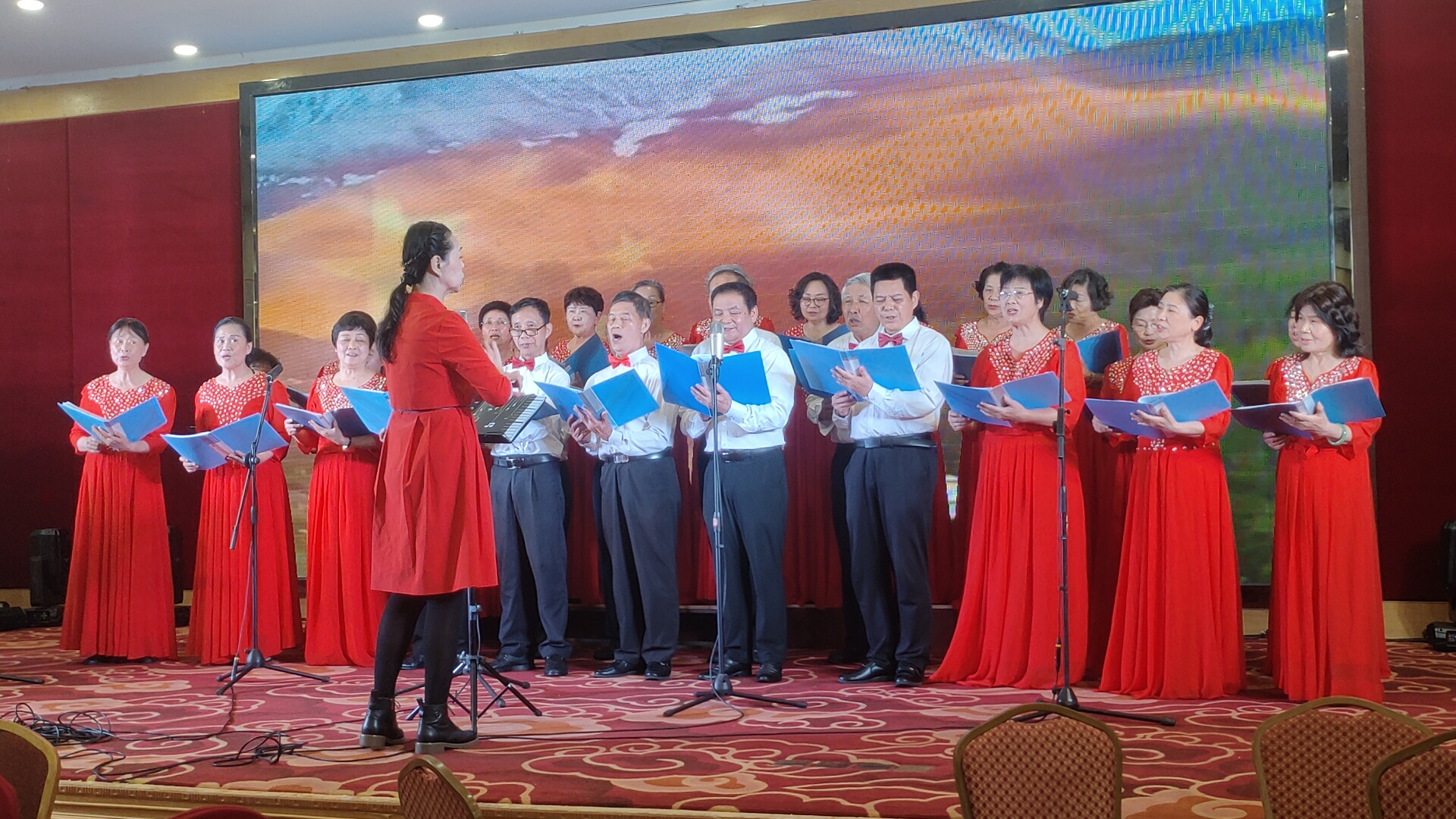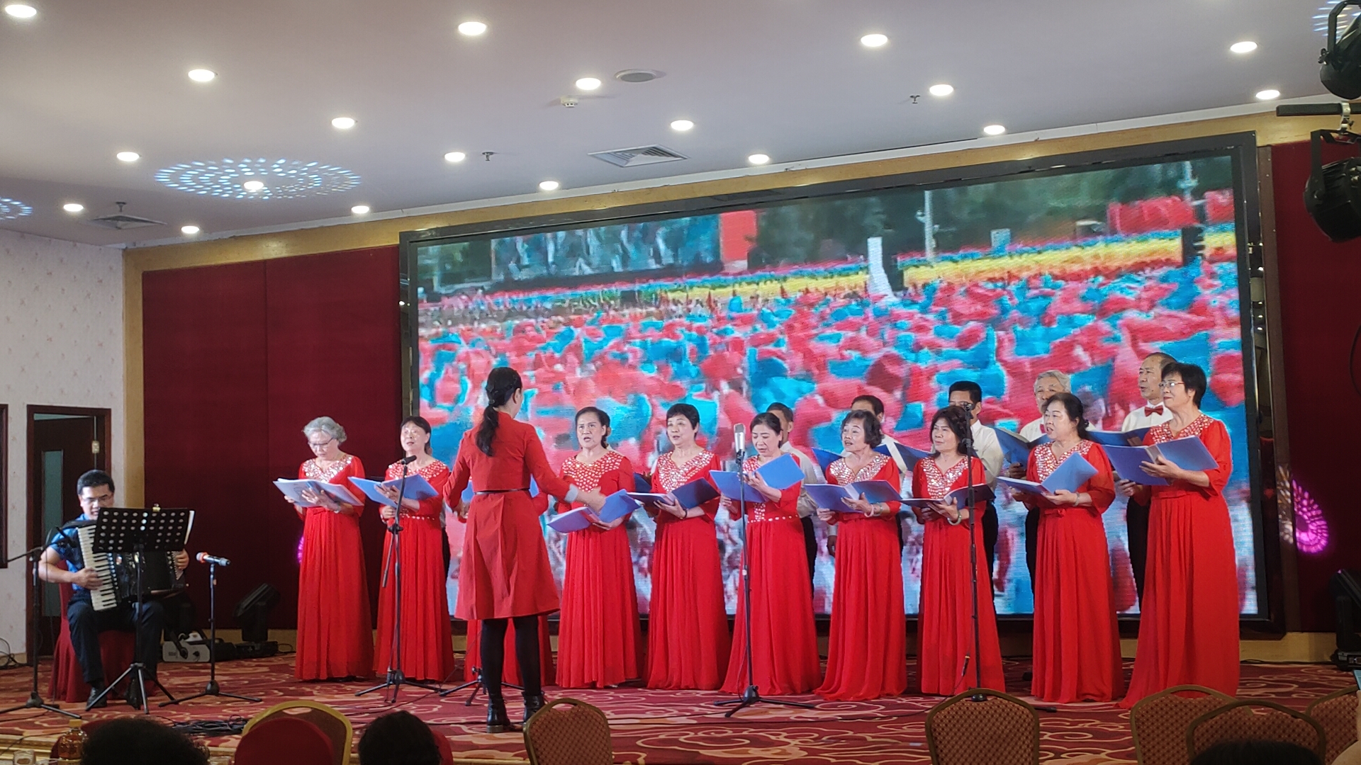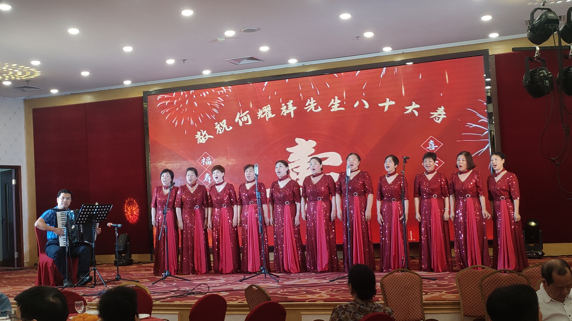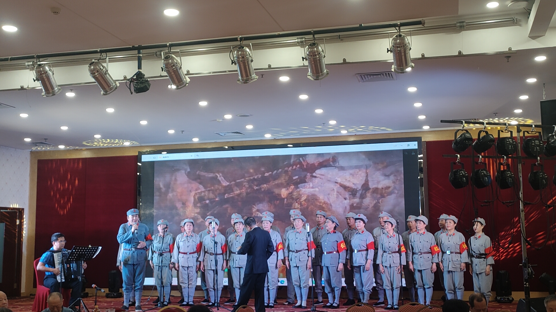 接着,女声独唱《好日子》,由水云深情演绎,歌声甜美嘹亮,唱出了美好生活的欢欣喜悦,也为何耀祥八十寿辰活动增添了浓浓的吉祥喜气;紧随其后,永乐艺术团大合唱《四渡赤水出奇兵》,由大吉、万青等声乐组成员倾情演唱,林克西再次执棒指挥,手风琴庄理晖伴奏,演唱者们气势磅礴、铿锵有力,用歌声重温峥嵘岁月,传递家国情怀,赢得全场阵阵喝彩。
