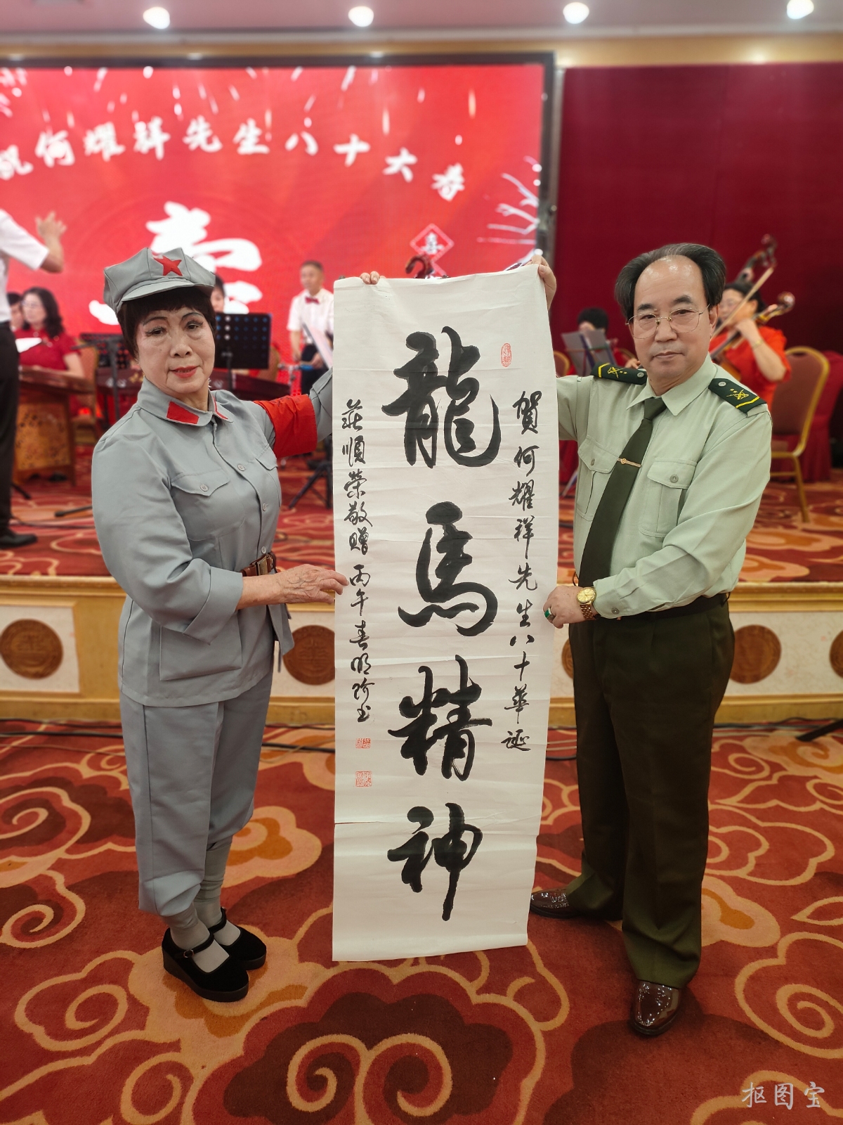 其中,庄顺荣先生特意委托石家庄铁道大学经济管理系原书记、书法家徐明阶,精心书写了创意字《寿》及行书《龙马精神》两幅书法作品,作为生日礼物赠予何耀祥团长。笔墨寄情,墨香传福,在此,衷心地感谢书法家徐明阶赐墨。创意字《寿》由草书“壹”“百”“年”三字组合而成,寓意长寿百岁;行书:《龙马精神》寓意精神矍铄,活力无限。这两幅书法作品既饱含对寿星何耀祥先生八十大寿的诚挚祝福,也祝愿他永葆精气神,福寿安康,成为本次寿辰活动中一份意义非凡的珍贵礼物。