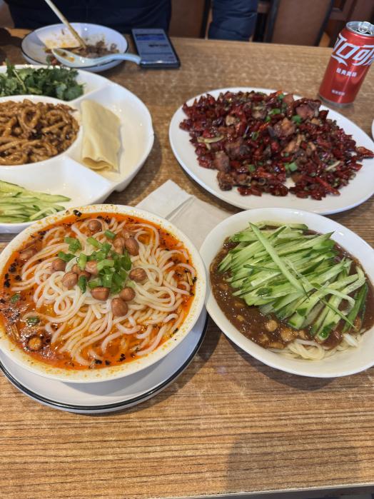 水煮鱼鱼片滑嫩,麻辣鲜香汤汁浓郁,配菜豆芽吸味;辣子鸡外酥里嫩,肉多椒香,手撕包菜猛火爆炒,咸香入味很下饭。