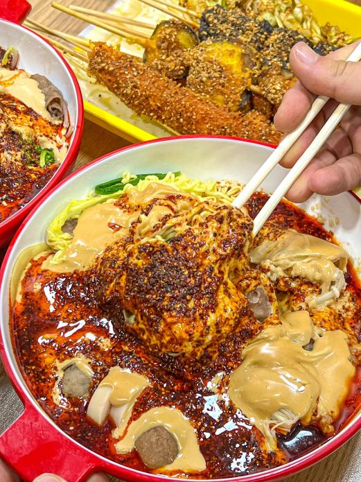 自选麻辣烫可做黏糊糊麻酱口,蔬菜丸子吸满浓稠酱汁,麻香浓郁;搭配现炸串,淀粉肠焦脆,里脊肉鲜嫩,刷秘制酱很合味。