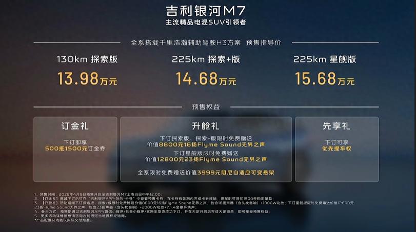 还在为电混SUV的续航焦虑、油耗过高发愁?吉利银河M7今日正式开启预售,13.98万起的预售价格,带来满油满电1730km超长续航、馈电3.35L/100km超低油耗的硬核实力,直接戳中家用用户的核心需求。