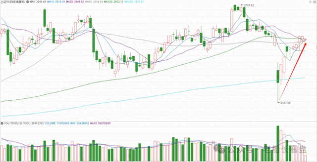 上证50指数,过去三个交易日的走势,基本是同一个套路,都是盘中调整,最后探底回升,表现在K线上,就是实体和下影线都比较明显,且二者长度几乎一致。很多人都认为这样的K线反映了救市的决心,但是,客观来说,如果想拉升,直接就可以拉起来,为何还要盘中宽幅震荡呢。所以,我们还是要从常规角度去分析K线,这说明大盘指数短线走势并不强。