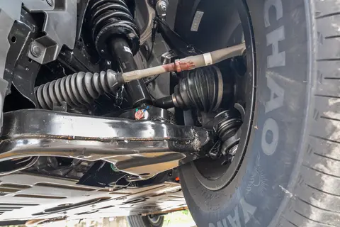 非承载式车身与高强度大梁:车辆采用非承载式车身结构,并搭配了内高压一体式大梁。其一体式纵梁长度达到了2184mm,且高强度钢占比高达99%,为极端越野冲击提供了坚实的车身刚性保障。