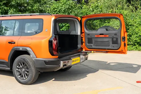 4、车尾部分:侧开式尾门搭配外挂式备胎(“小书包”);越野风格后包围与双侧拖车钩强化硬派属性;尾灯支持智慧灯语,可显示多种交互图案。