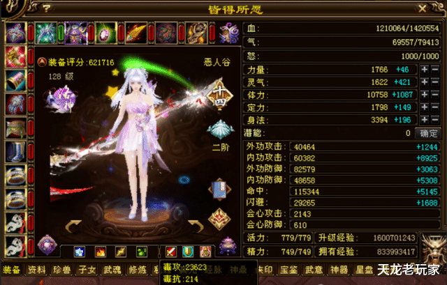 带上心眼·毒的恶人谷大佬最新装备:128级,血量142万,蓝量7.9万,命中11.5万,闪避2.9万,会心攻击2143,会心防御610,主毒攻击23623!