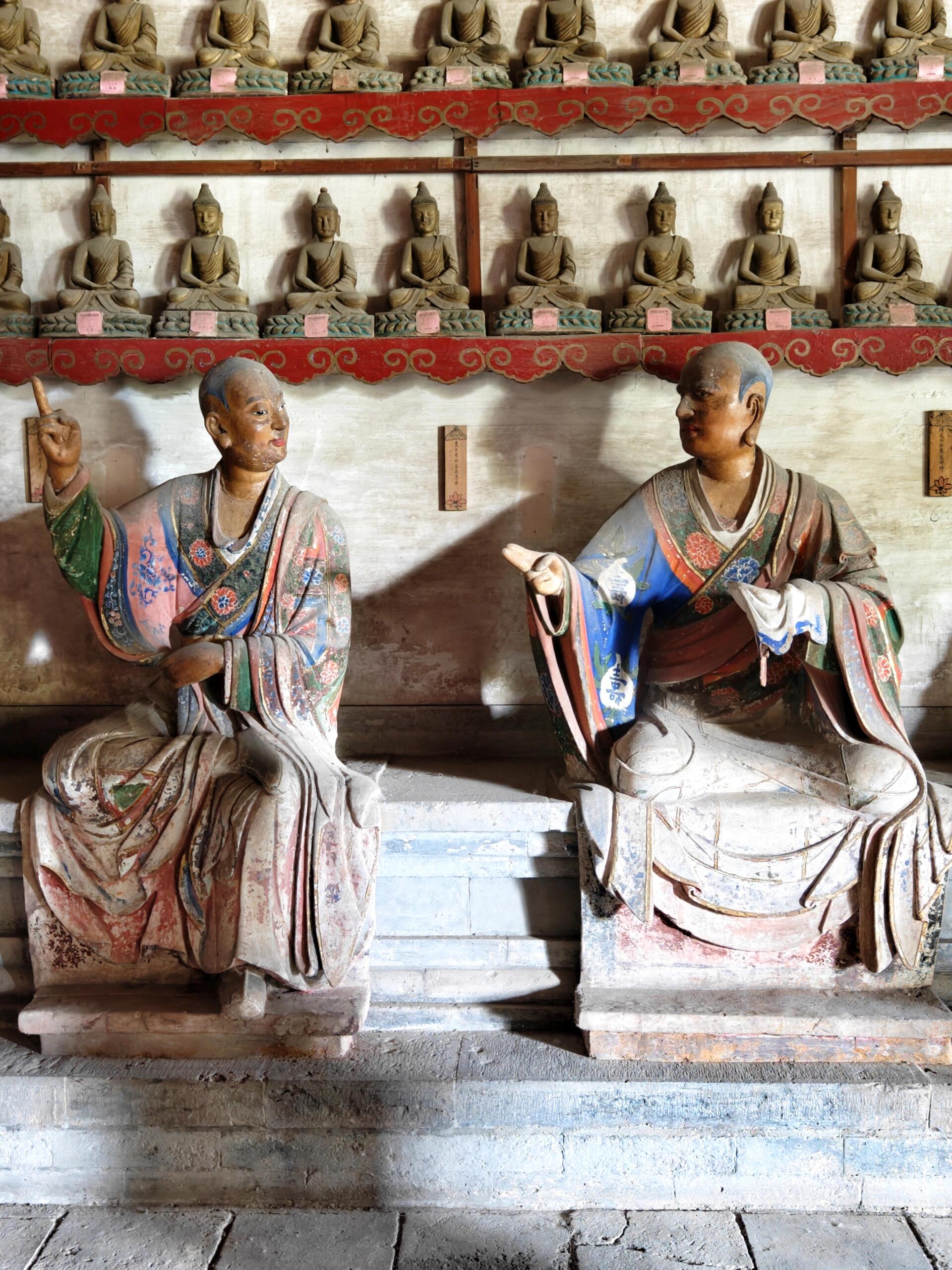 千佛殿里的宋明罗汉像,是灵岩寺的灵魂所在,也是中国古代造塑艺术的天花板。民间有“天下罗汉两堂半”的说法,其中一堂就在这里。四十尊罗汉,写实传神,神态各异,没有千佛一面的刻板,每一尊都有骨有肉、有情绪有性格,或闭目沉思,或淡然微笑,或刚正威严,仿佛下一秒就会开口说话。梁启超当年亲见,提笔写下“海内第一名塑”,这五个字不是溢美,是内行对绝顶技艺的认可。这些塑像不以华丽取胜,而以气韵动人,衣褶的处理、肌肉的起伏、眼神的分寸,都精准到极致。站在殿内,你不会觉得面对的是泥塑,而是一群有温度、有阅历的修行者,他们跨越数百年,与每一个认真注视他们的人对话。