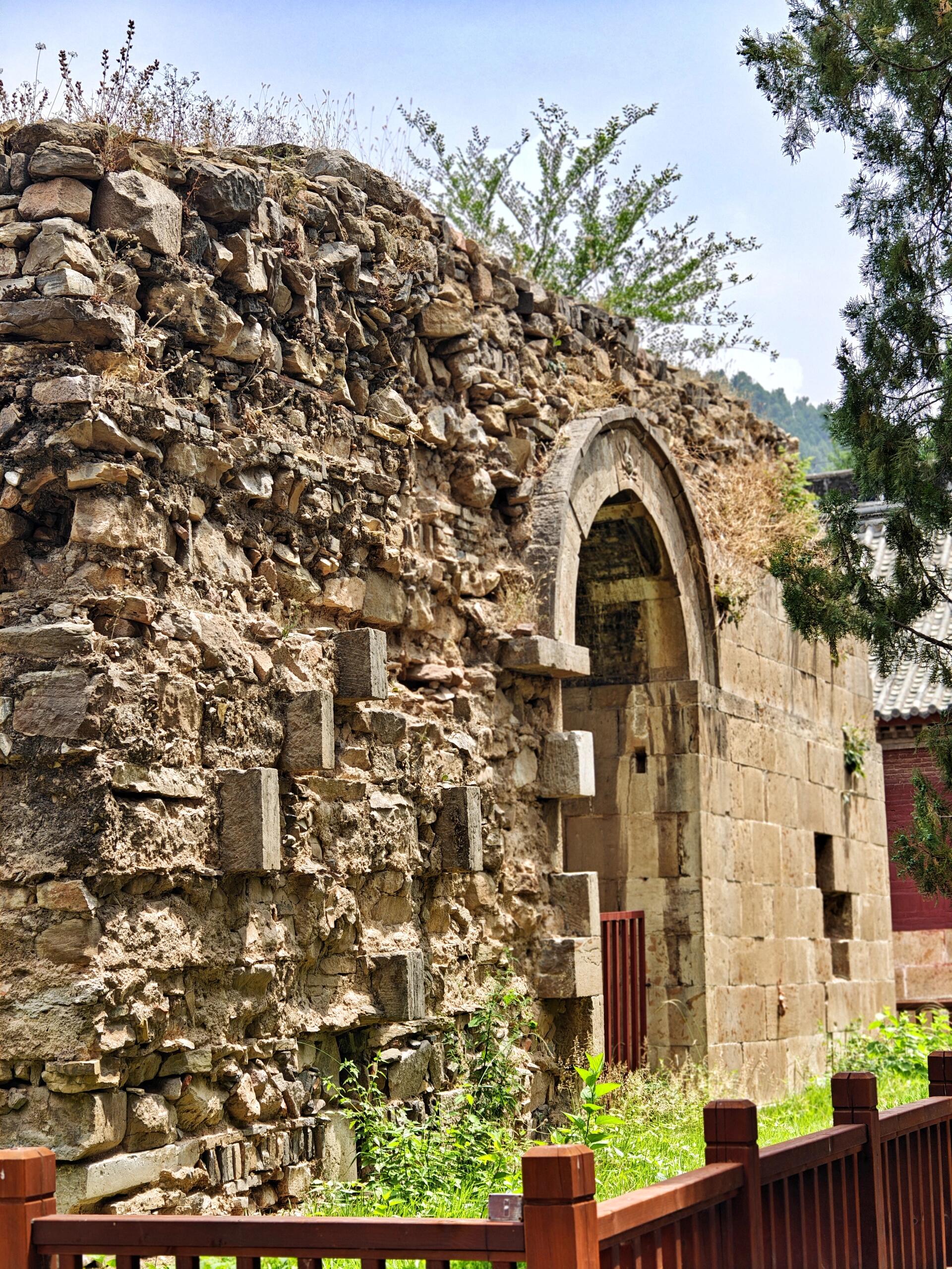 御书阁最初为供奉唐太宗手敕而建,宋重修、明重建,虽御书早已不存,但建筑本身就是一部皇权与佛教互动的历史。般舟殿只剩遗址,唐代石基、宋代砖砌清晰可辨,残垣里藏着寺院早年的格局。鲁班洞是更早的山门遗迹,石砌拱券,年代不晚于隋,是国内已知较早的拱券式门洞,石壁上留有唐代李邕的碑刻残石,可惜暂不对外开放,也给灵岩寺留下一段待解的隐秘历史。五花殿在宋代盛极一时,供奉观音,后毁于大火,如今只剩高大石墙,站在遗址前,仍能想象当年香烟缭绕、殿宇崇丽的景象。