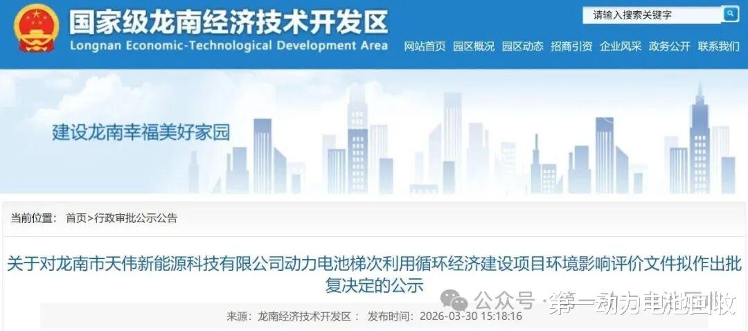 第一动力电池回收消息,3月30日,江西省赣州市龙南经济技术开发区发布了关于对《龙南市天伟新能源科技有限公司动力电池梯次利用循环经济建设项目》环境影响评价文件拟作出批复决定的公示。