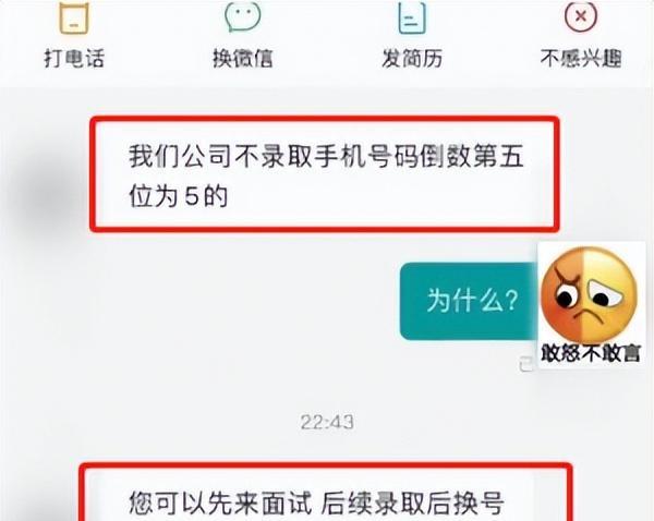 该教育公司却要求应聘的学生,手机号倒数第五位数,不能是5,否则公司不予以录用,学历再高能力再强也不行。可能大家从来没想过,手机号码有一天会成为自己找工作的拦路虎。难道手机号和学生的工作能力有某种必然联系吗?