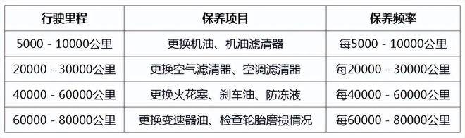 为了更直观地说明行驶里程与保养频率的关系,以下是一个常见的保养周期参考表格: